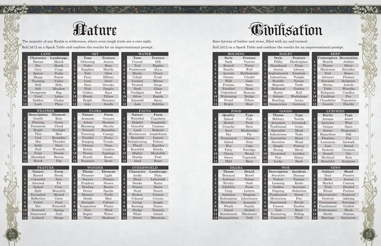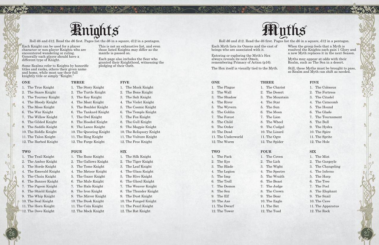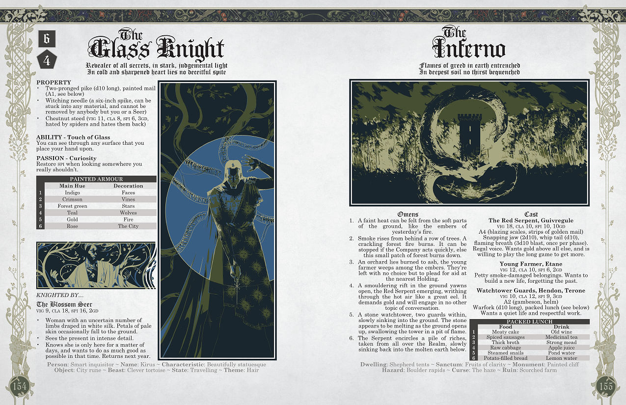 The streamlined rules support a campaign of exploration, where you traverse your own hex-mapped realm filled with myths. Each slowly revealing their omens as you journey through their land. The book comes with 72 of these Myths, enough to know there’s always a new surprise hidden in the woods.