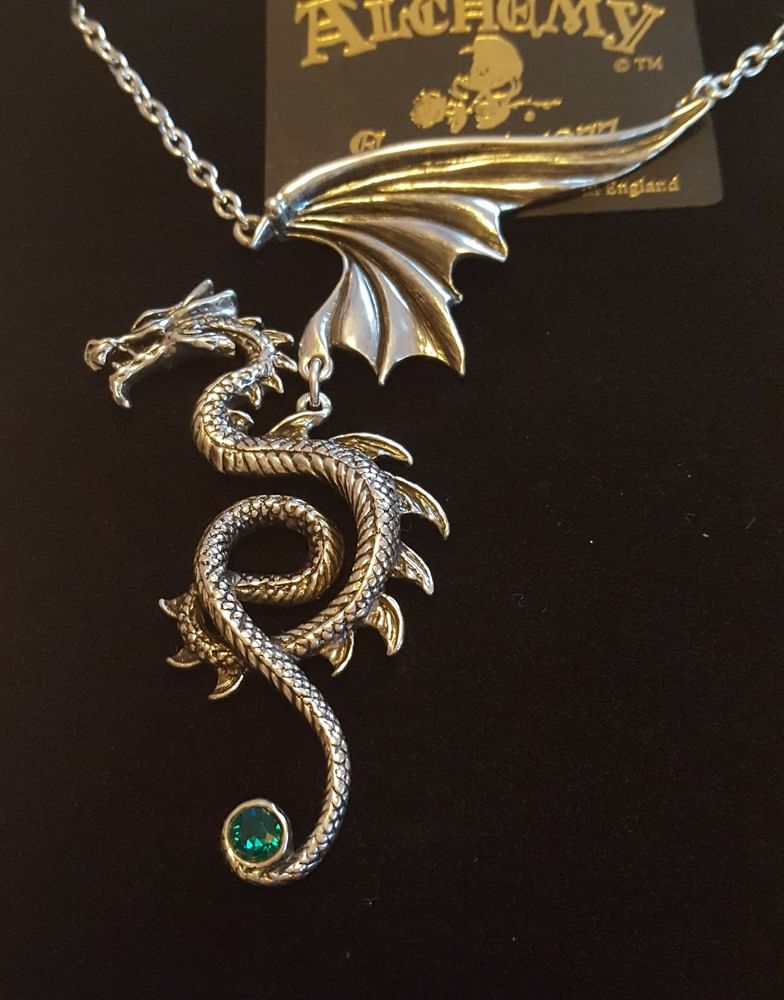 Nádherný náhrdelník s veľkým pewterovým okrídleným drakom. Výška samotného draka je cca 7,5 cm, hrot jeho chvosta je osadený smaragdovo sfarbeným kamienkom Swarovski.