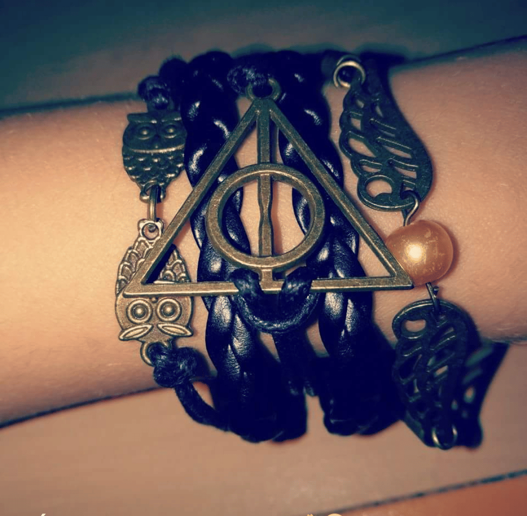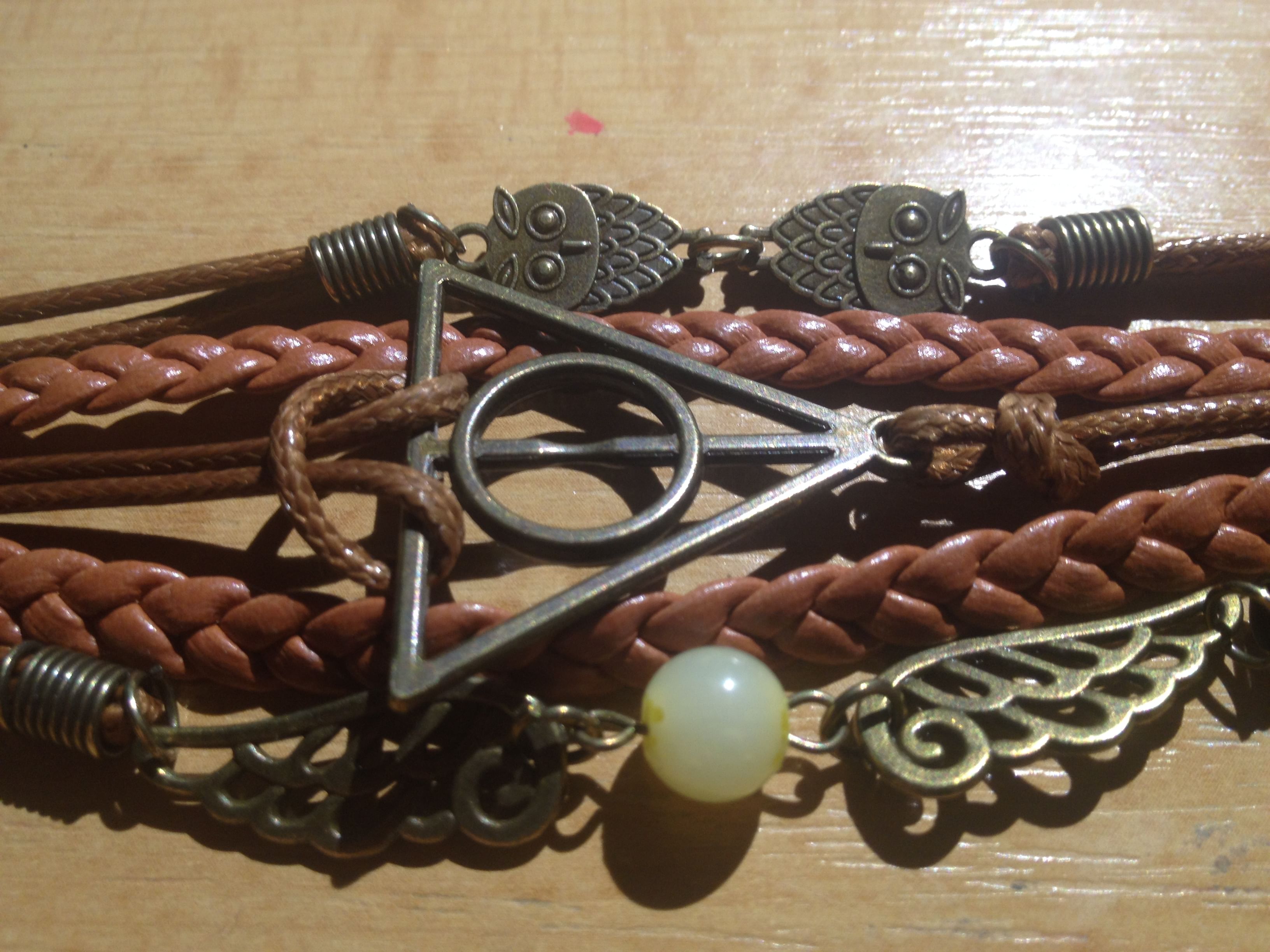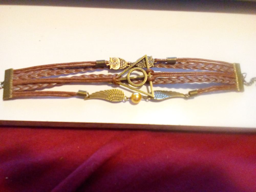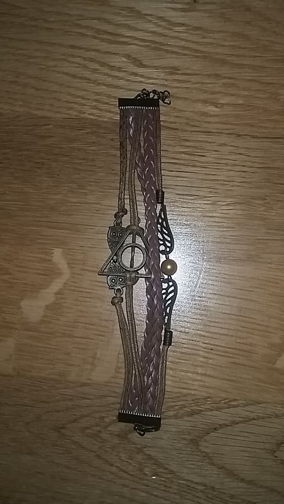 Náramok je pekný, páči sa mi prepojenie viacerých symbolov v jednom výrobku - dary smrti, dve sovičky typické pre film a zlatá strela s krídlami :) Škoda že nebolo na výber z viacerých veľkostí, pretože je mi trošku väčší. A tiež by sa hodilo trošku lepšie a pevnejšie upevnenie povrázkov. ;)
