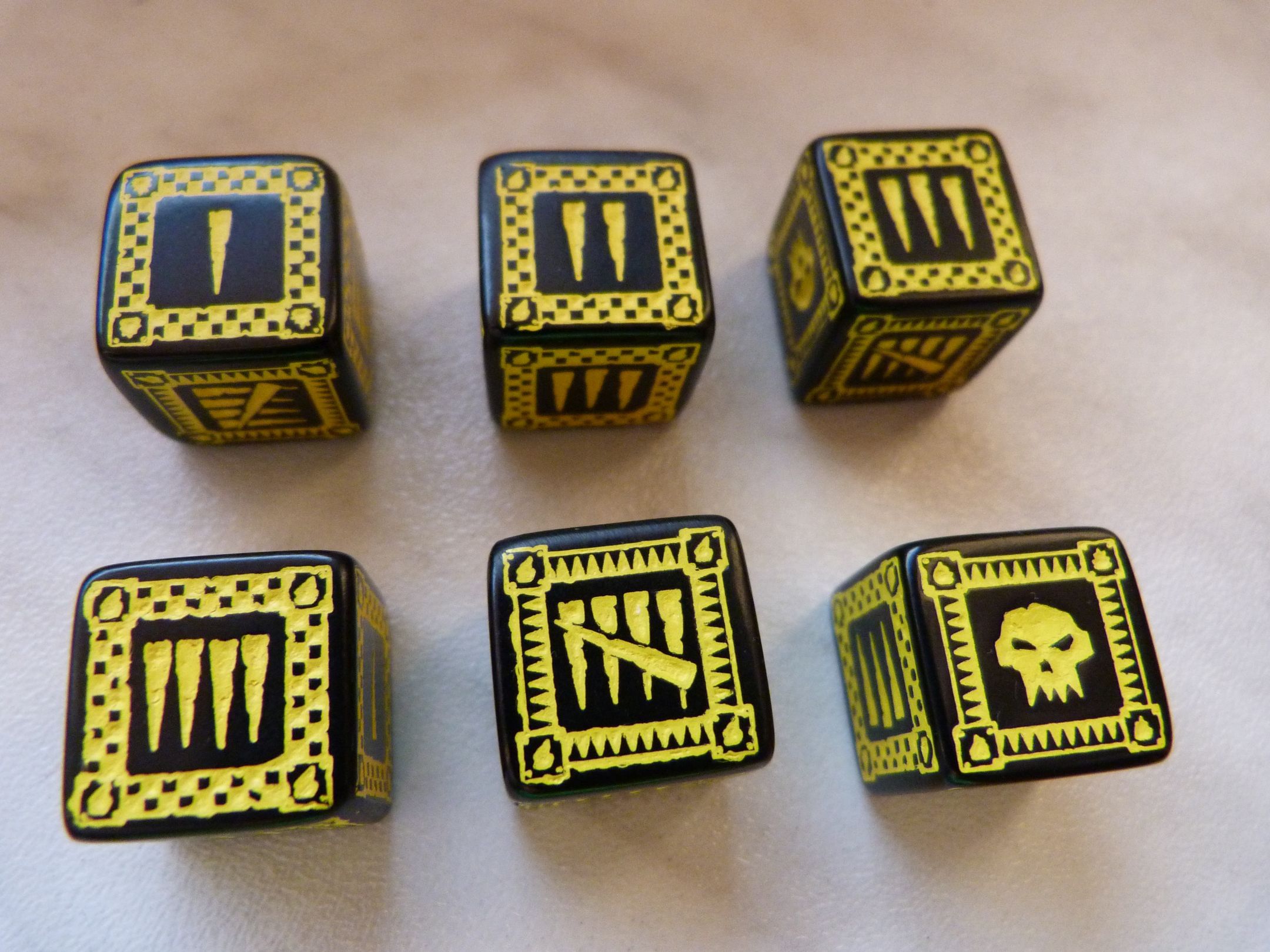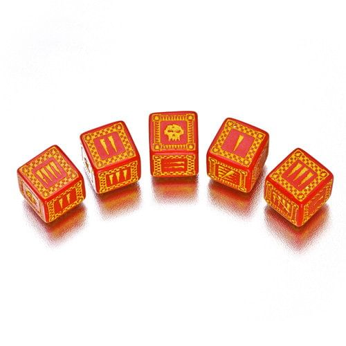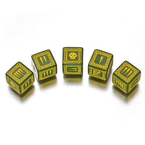 Sada piatich šestistěnných kociek. Namiesto šestky je štylizovaná Orkská lebka, jednotlivé čísla sú reprezentované zárezy. Vskutku štýlový doplnok pre Vaše hranie! Priemer kocky je cca 1,4 mm.