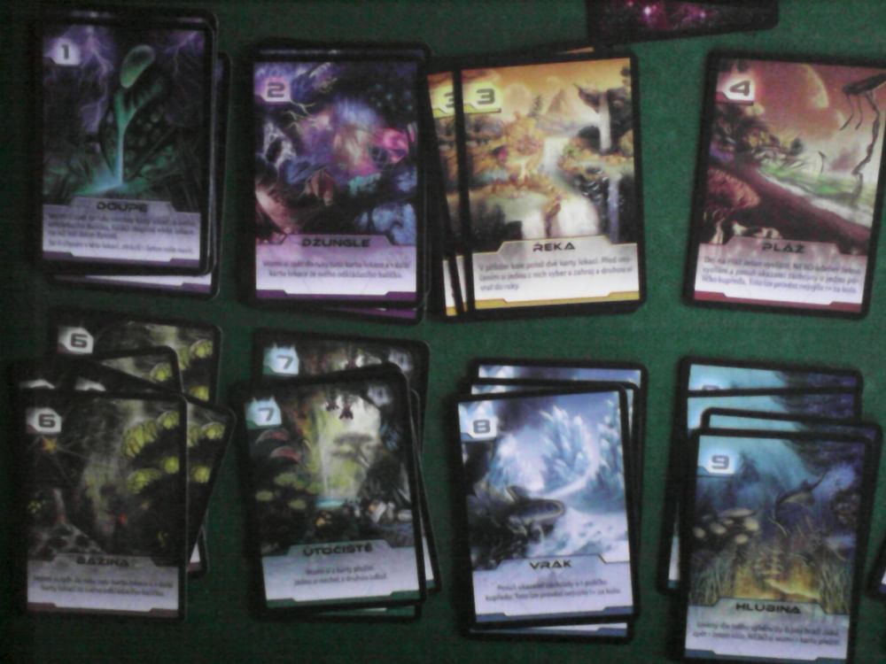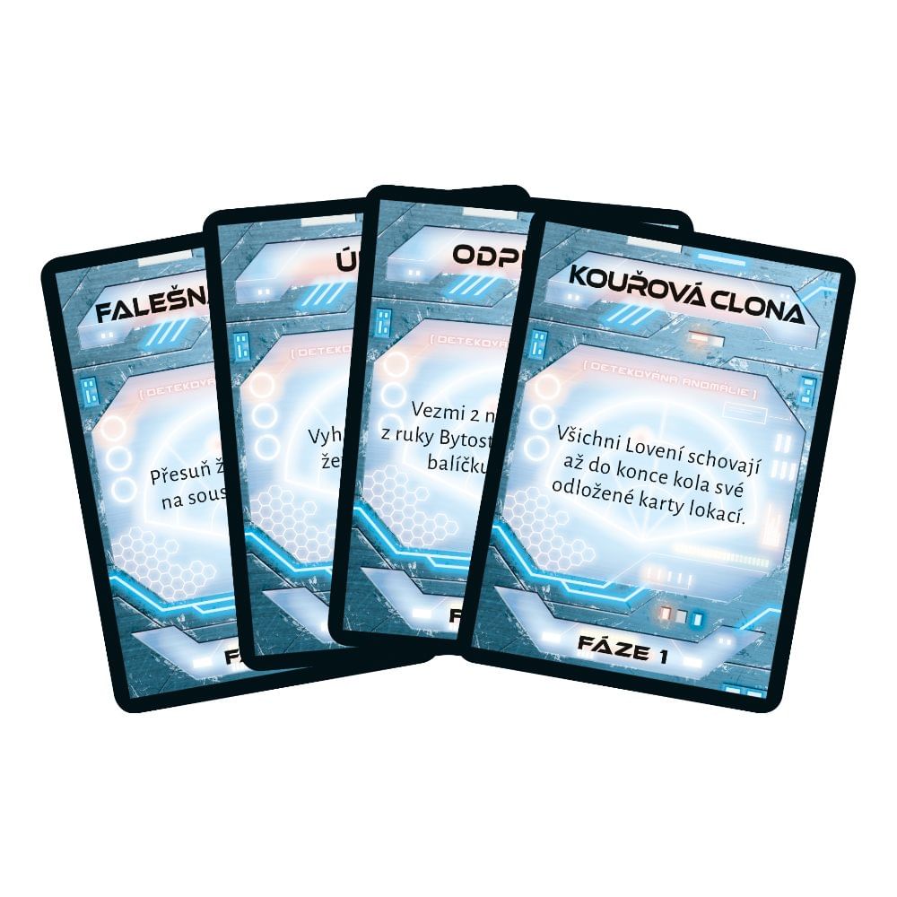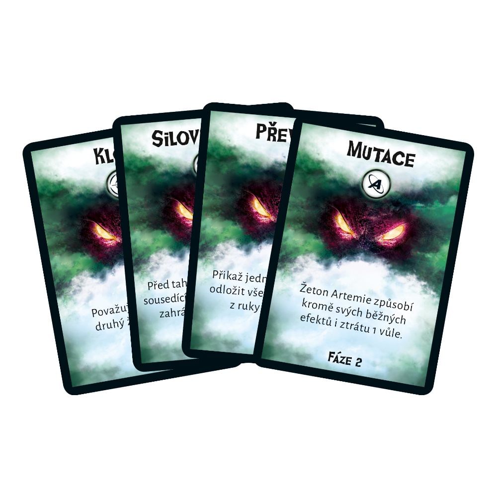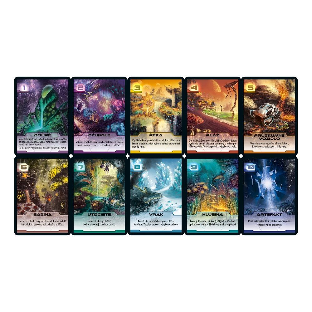 Hru dodávame vrátane minirozšíření, ktoré obsahuje dve nové varianty karty lokácie č.10 Artefakt (každá ako všetky pokročilé lokácie v 4 kópiách) a po jednej karte lovu a prežitie.