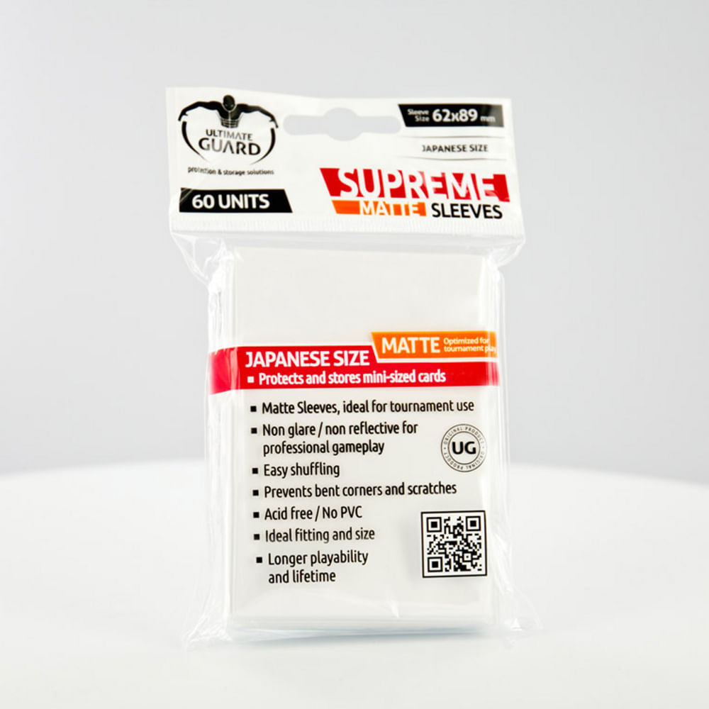 Matné obaly na karty veľkosti japaneese size od Ultimate Guard (Supreme). V balíčku je 60 ks obalov s rozmermi 62 x 89 mm s farebnou zadnou stranou. Obaly sú ideálne pre turnajové použitie, majú Antireflexívna povrch, ktorým svojho súpera neoslníte, ale aj napriek tomu zaujmete. A to aj vďaka tomu, že sa ľahko miešajú, ochráni proti ohnutým rohom a škrabancom. A v neposlednom rade sú ekologicky nezávadné.