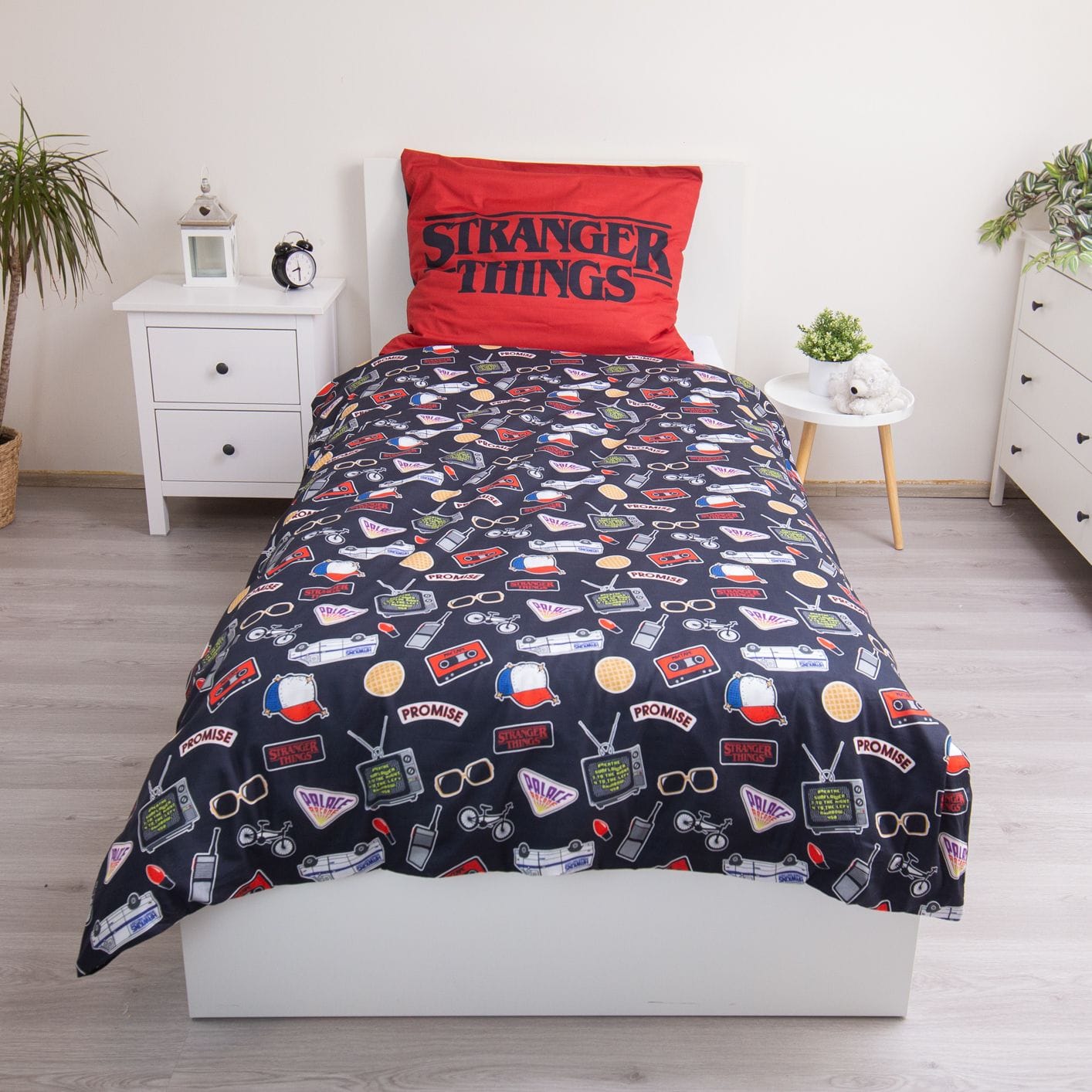 Táto posteľná súprava je must-have pre všetkých milovníkov Upside Down a Hawkins. Na vankúši ťa privíta legendárna hláška „Friends Don't Lie“ a na celej perine nájdeš ikonické prvky, ktoré ti pripomenú napínavé chvíle.