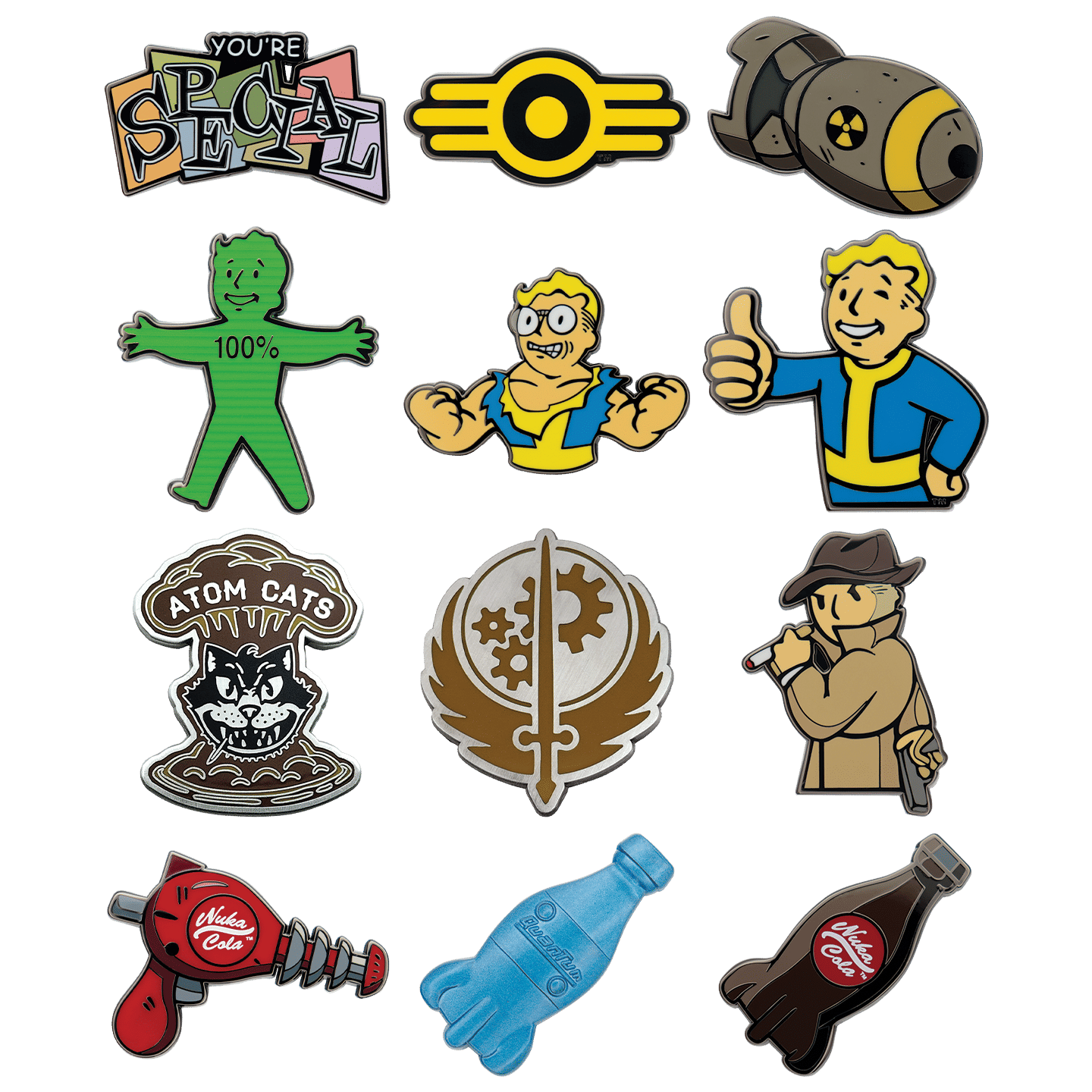 Čaká na teba 12 ikonických motívov: rôzne verzie Vault Boya, Vault-Tec, Brotherhood of Steel, Atom Cats, You’re SPECIAL, Nuka-Cola, Thirst Zapper, atómová bomba – a tá najžiadanejšia – metalická Nuka-Cola Quantum!