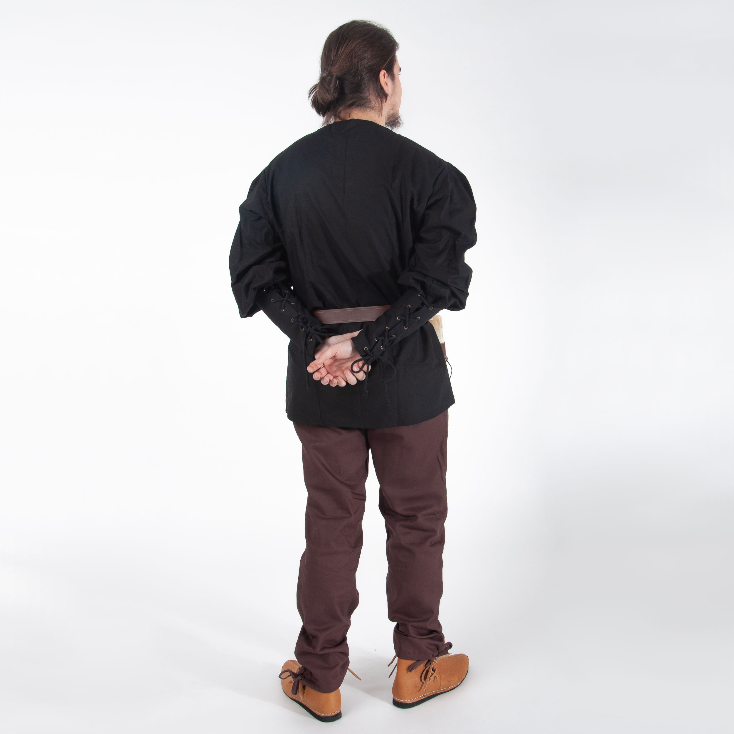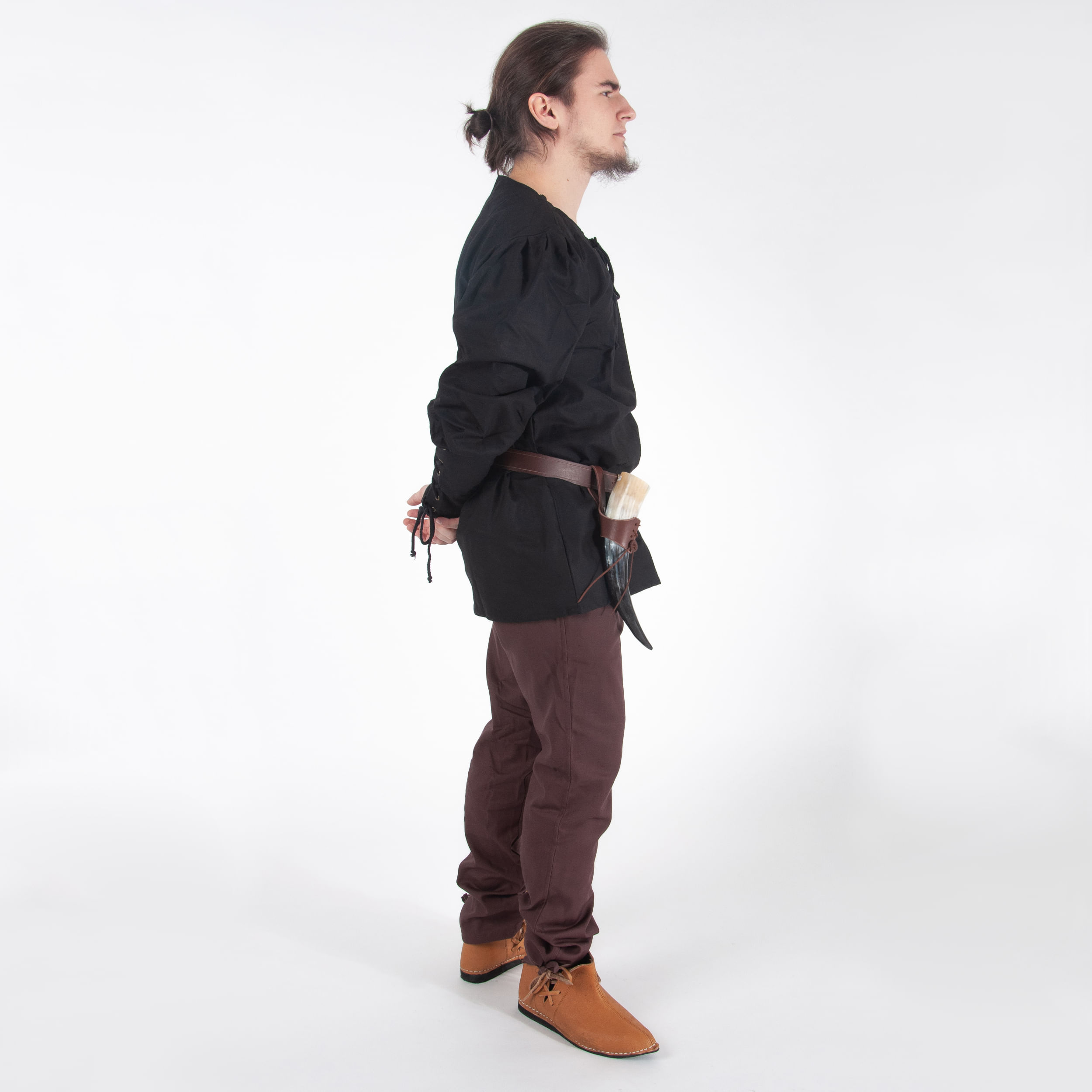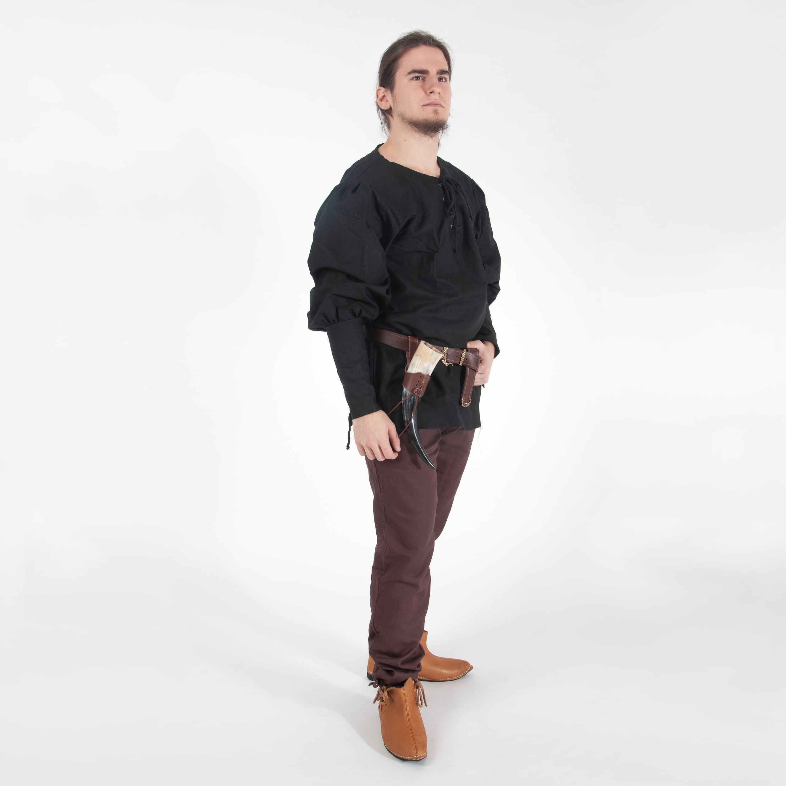 Klasická univerzální larpová košile, jen černá barva není moc vhodná na letní akce. Není přímo historická, ale zapadnete s ní víceméně všude, Příjemný materiál, vydrží.
