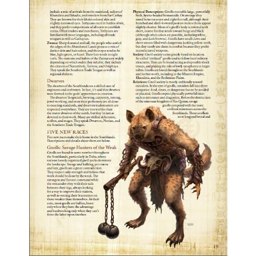 Southlands Campaign Setting offers everything you need to have legendary adventures in a sprawling continent of wealthy desert empires, demon-haunted jungles, and vast savannahs where gnolls and werelions hunt.