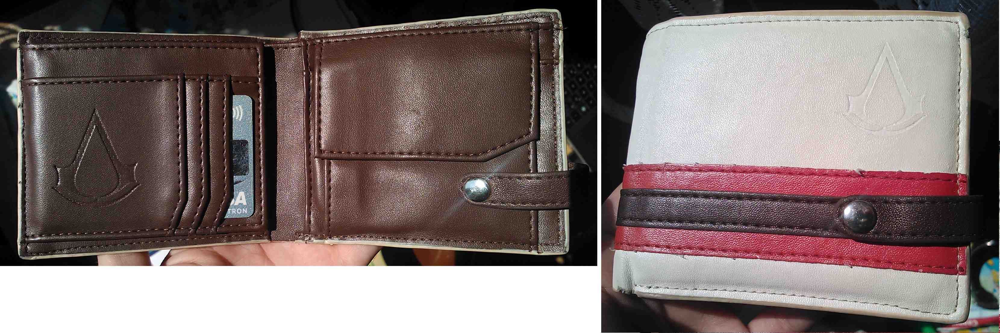 Luxusná koženková peňaženka s motívmi z počítačovej hry Assassins Creed. Obsahuje priehradku na mice, 8 priehradiek na kreditné karty a priehradku s okienkom.