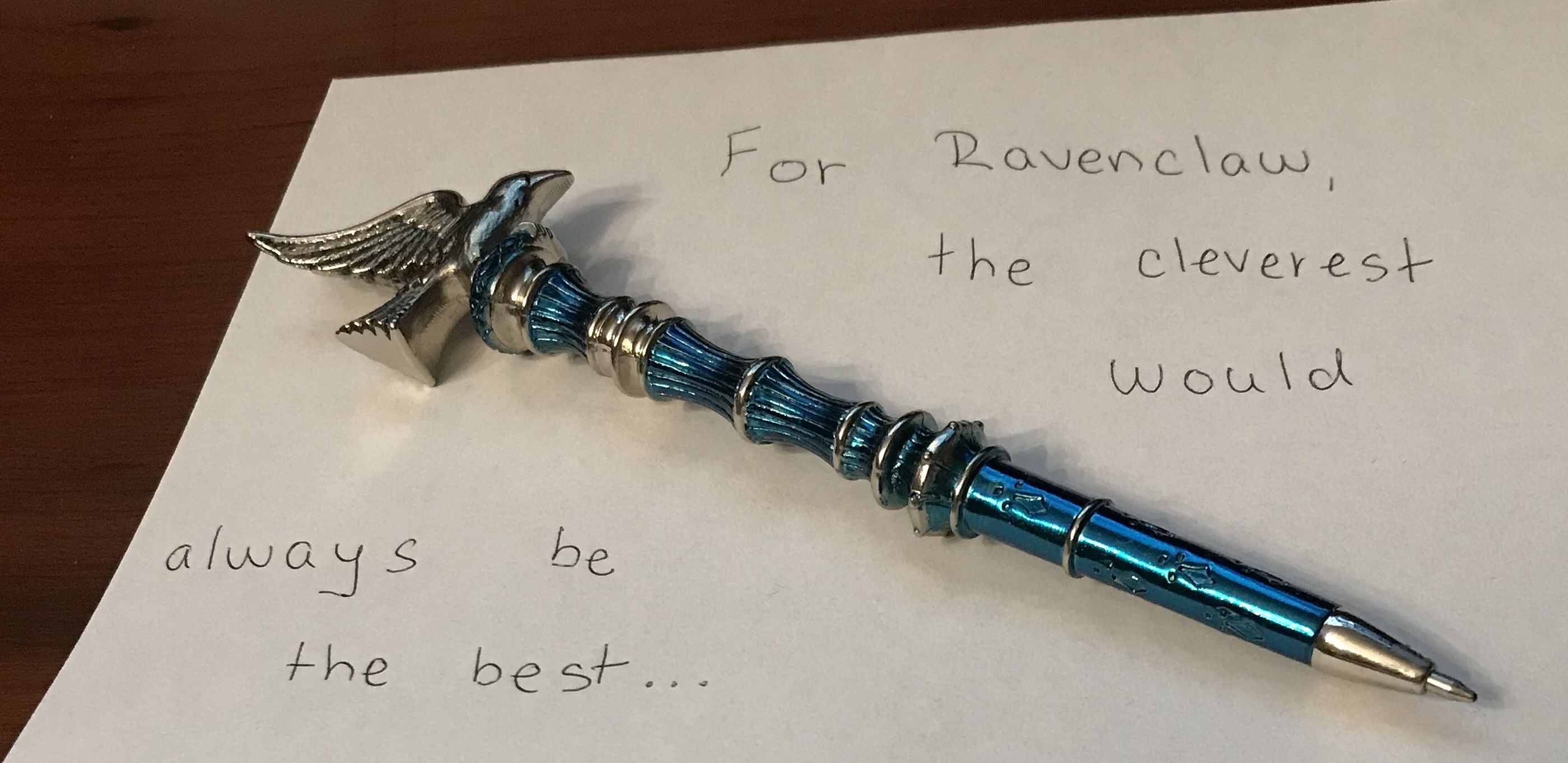Tato krásná propiska mi byla na Imagu zakoupena jako dárek a, až bude opět naskladněna, mám v plánu sama další kousek zakoupit a věnovat k narozeninám. Pisátko je nádherně vypracované a, ač je na první dojem krapet těžší do ruky, překvapivě dobře se s ním píše, neb je pěkně vyvážené. Propisku je taky možné rozšroubovat a vyměnit náplň - je to naštěstí obvyklý typ, který budou mít snad v každém papírnictví; to považuji za výhodu, leckteré novelty tužky bývají jednorázové, případně jsou v nich atypické náplně. Dárková krabička, v níž je propiska dodávaná, je taky moc pěkná. Jako jediný potenciální nedostatek vidím to, že barva (v tomto případě havraspárská modř) působí dojmem, že se bude postupem času otřískávat. Snad ale půjde spíše o dojem patiny z používání a pero nezoškliví příliš brzy... Chci tomu věřit. :-D Doporučuji jako pěkný dárek, vzhledem k váze pera ale spíše pro dospělé a teenagery než pro dětské potterheady.