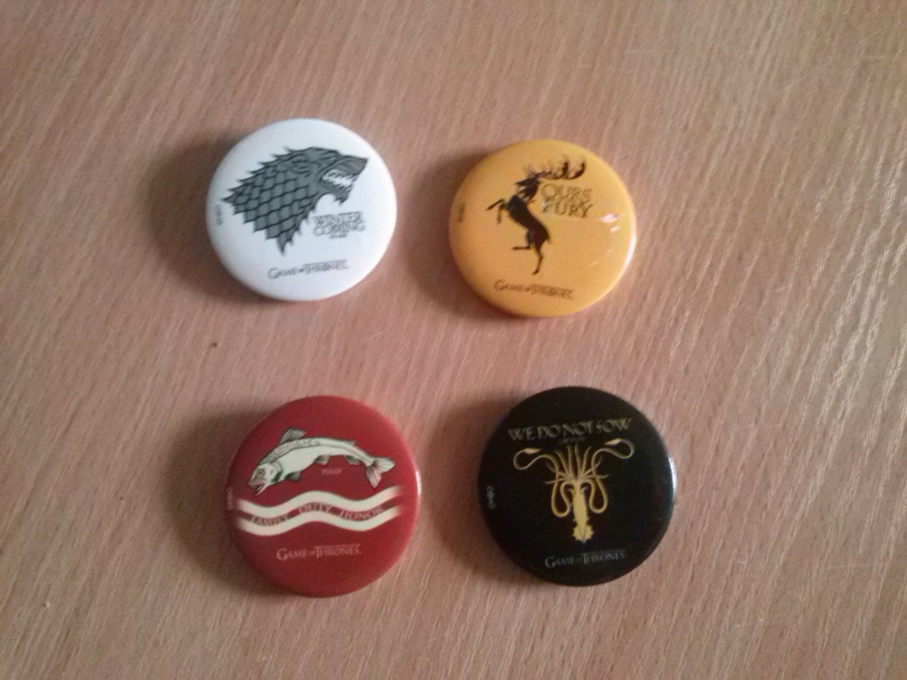 Sada obsahujúca štvoricu placiek s priemerom 32 mm s motívmi zo seriálu Hra o tróny - Game of Thrones, ktorý bol natočený na motívy rovnomennej knižnej predlohy G. R. Martina.