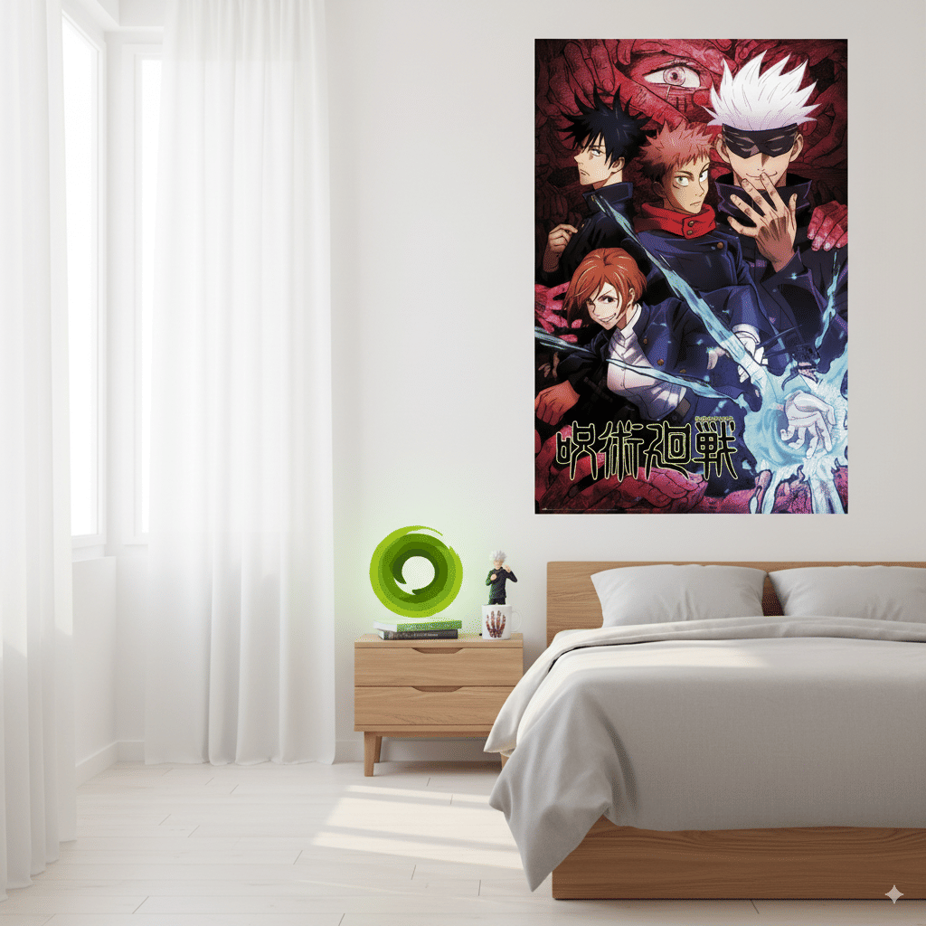 Tento plagát s grafikou populárnej japonskej manga Jujutsu Kaisen s postavami ako Itadori, Fushiguro, Kugisaki a Gojo poteší fanúšikov a hodí sa na stenu doma aj v pracovni.