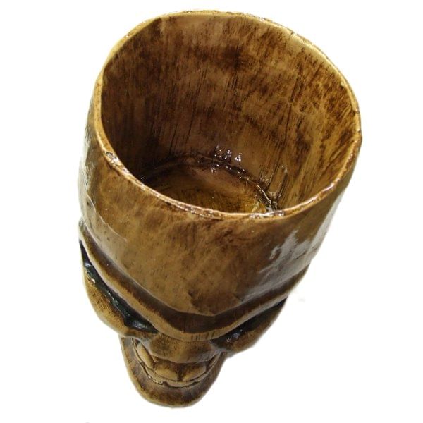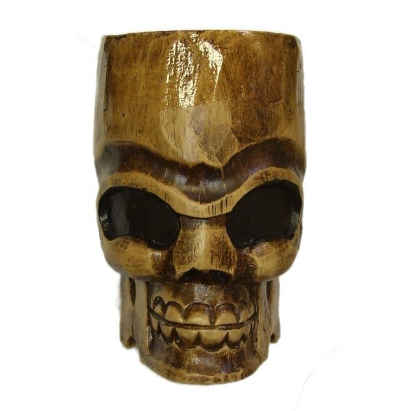 Rozmerný drevený pohár (výška cca 28 cm, priemer 11 cm) štylizovaný do podoby lebky. Pohár je ručne vyrezávaný, vnútri ošetrený lakom.