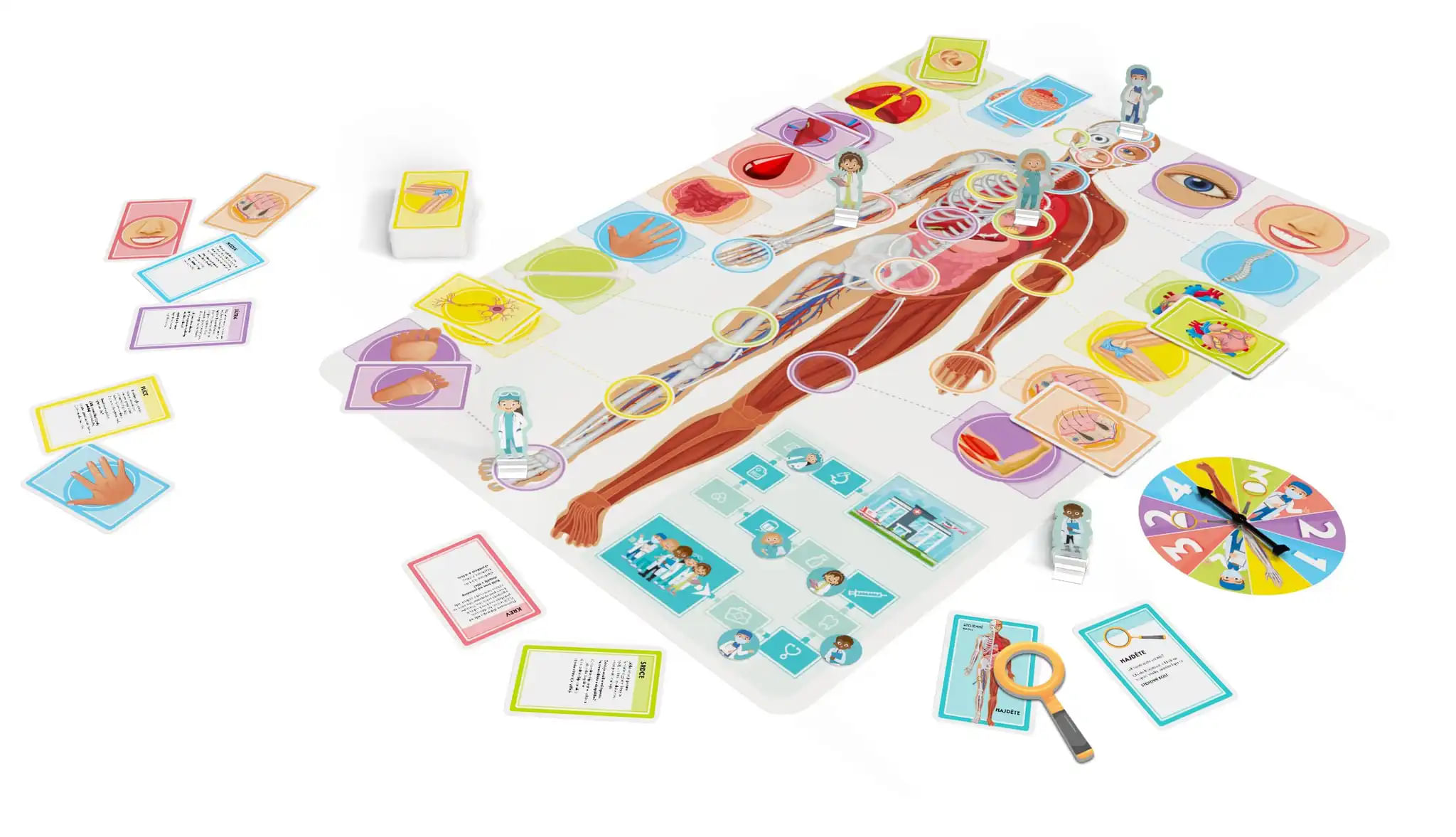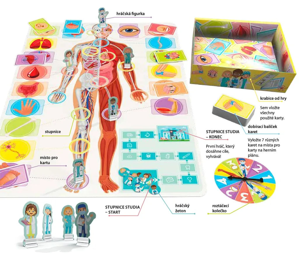 Prvý hráč, ktorý dorazí do cieľa, sa stane doktorom. Pohybuj svojou figúrkou po hernom pláne, odpovedaj na zábavné otázky o ľudskom tele a o tom, ako funguje, a sám si vyskúšaj rôzne pohyby. Úspešné zvládnutie úloh ťa posunie vpred na ceste k tomu, aby si sa stal doktorom, ale ostatní hráči sa budú snažiť byť ešte rýchlejší ako ty.