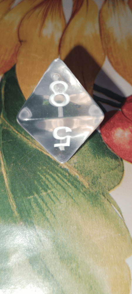Priesvitná osemstenný hracia kocka, hádže čísla 1-8. Hodí sa ku všelijakým stolným hrám a hrám na hrdinov.