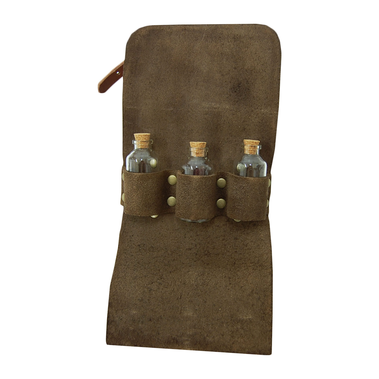 Súčasťou sú tri sklenené fľaštičky s korkovou zátkou (veľkosť fľaštičky je cca 3 x 7 cm). Veľkosť puzdra je 15 x 10 x 5 cm, zhotovené je z cca 3 mm hrubej kože - štiepenky.