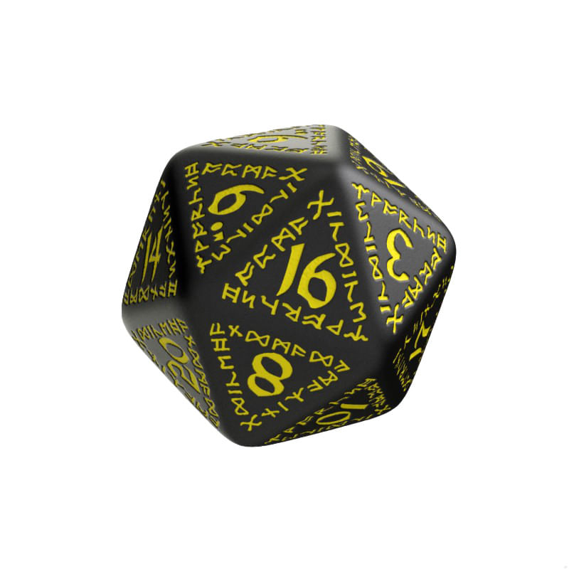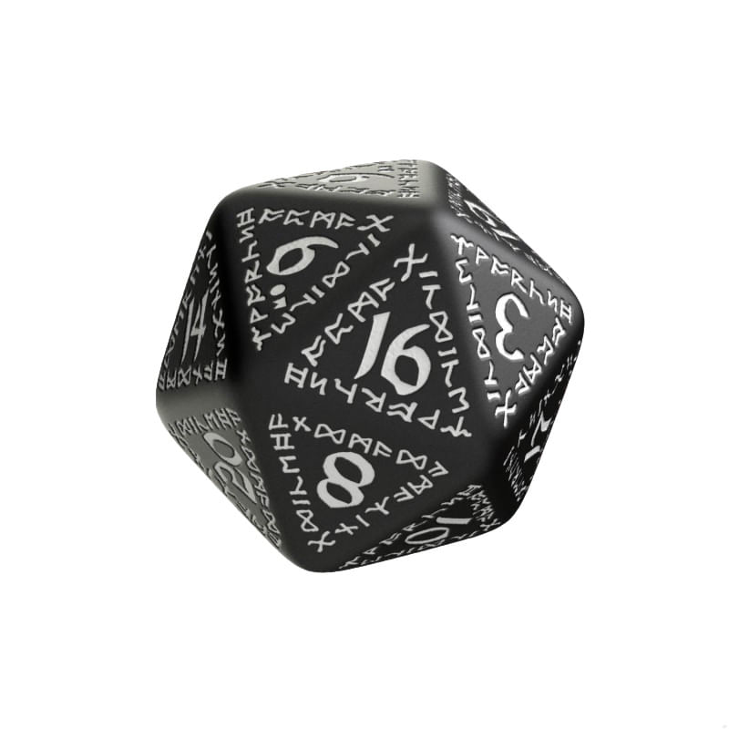 Bielo-čierna dvadsaťstenná kocka zdobená trpasličími runami, ideálny doplnok napríklad pre hráčov hry Magic, ako počítadlo životov.