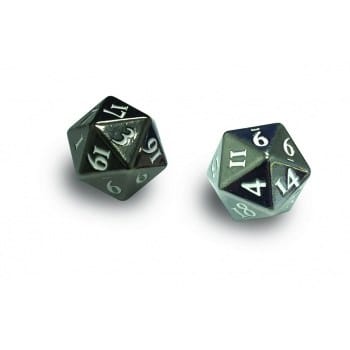 Sada obsahuje 2 ks kovových dvacetistěnných kociek D20 v elegantných farbách. Kocky sú vyrobené zo zliatiny zinku, s náhodne rozloženými bielymi číslami.