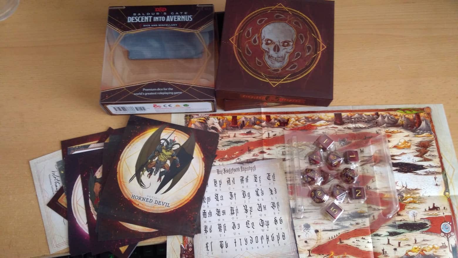 Sada kociek Dungeons & Dragons Baldur 's Gate: Descent into Avernus obsahuje 11 kociek (2d20, 1d12, 2d10, 1d8, 4d6 a 1D4), ďalej odolný zásobník na kocky s podšívkou vnútri dvojdielne škatule, 20 obojstranných kariet stretnutia a príbehu pre démonov a diablov Krvavé vojny (s exkluzívnymi obrázkami od Maxa Dunbar), exkluzívny kartu s obsahom (pre "Strange Encounters a Trinkets One Finds in Avernus"), zloženú mapu Avernus pre hráčov a tabuľku veľkostí démonov a diablov Krvavé vojny.