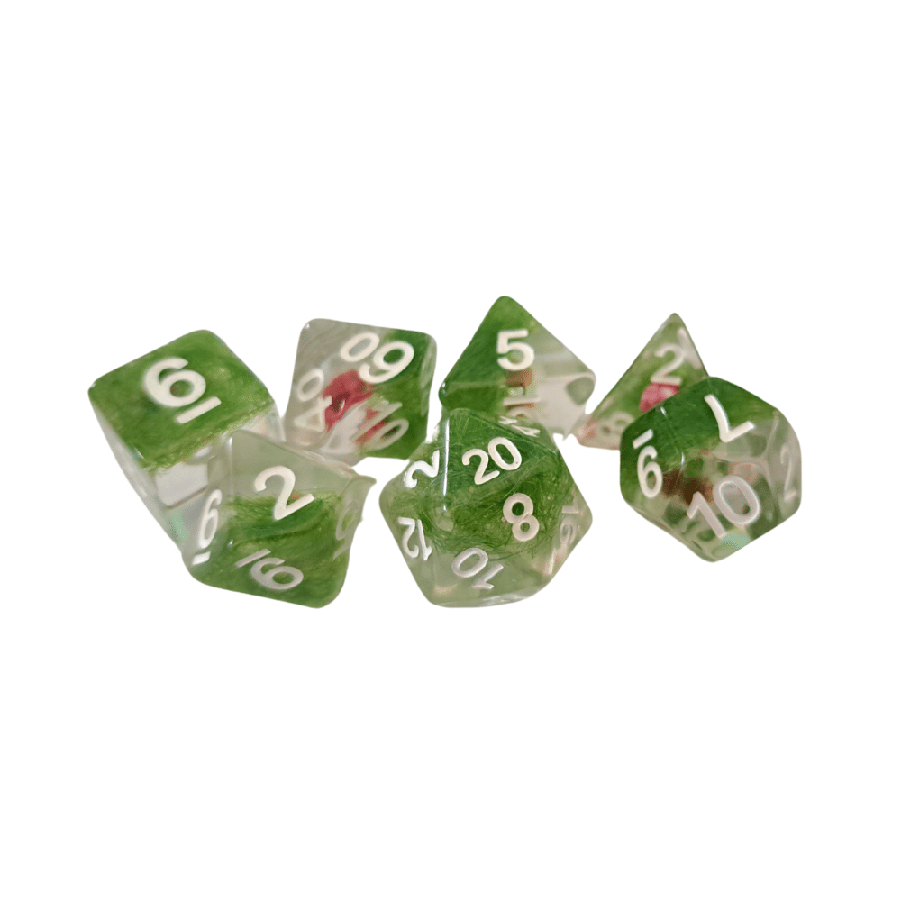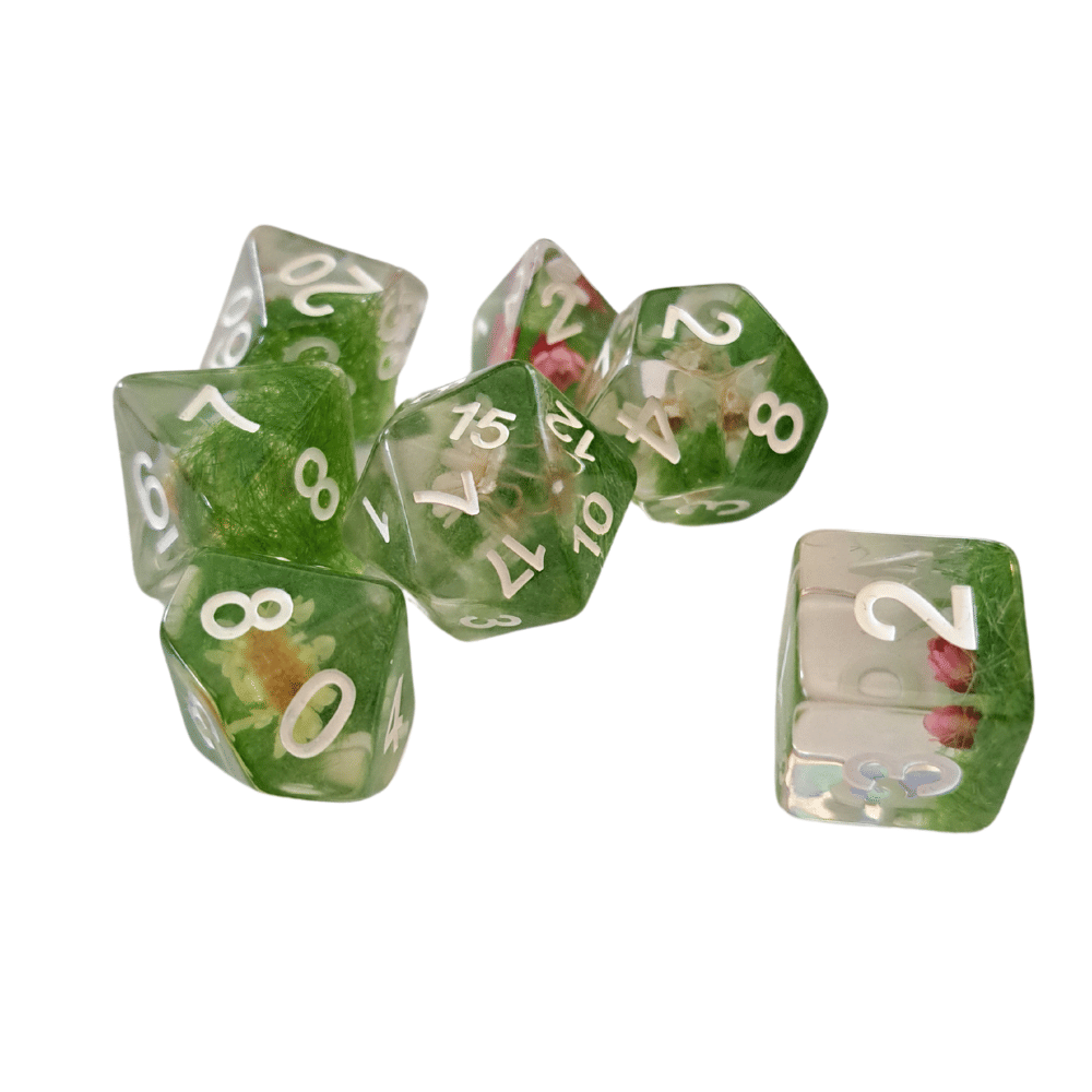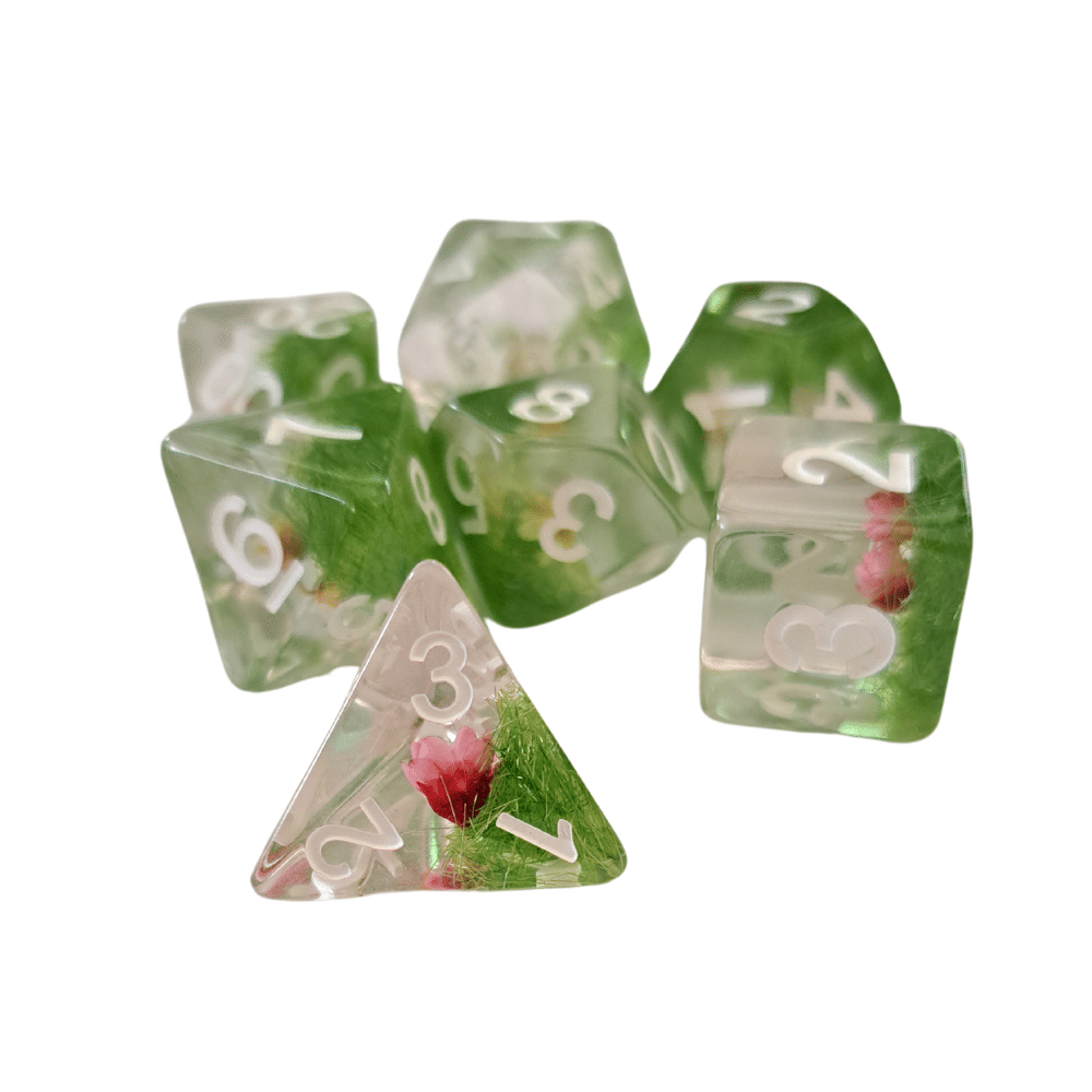 - sada 7 priehľadných RPG kociek s kvetmi a machom vo vnútri