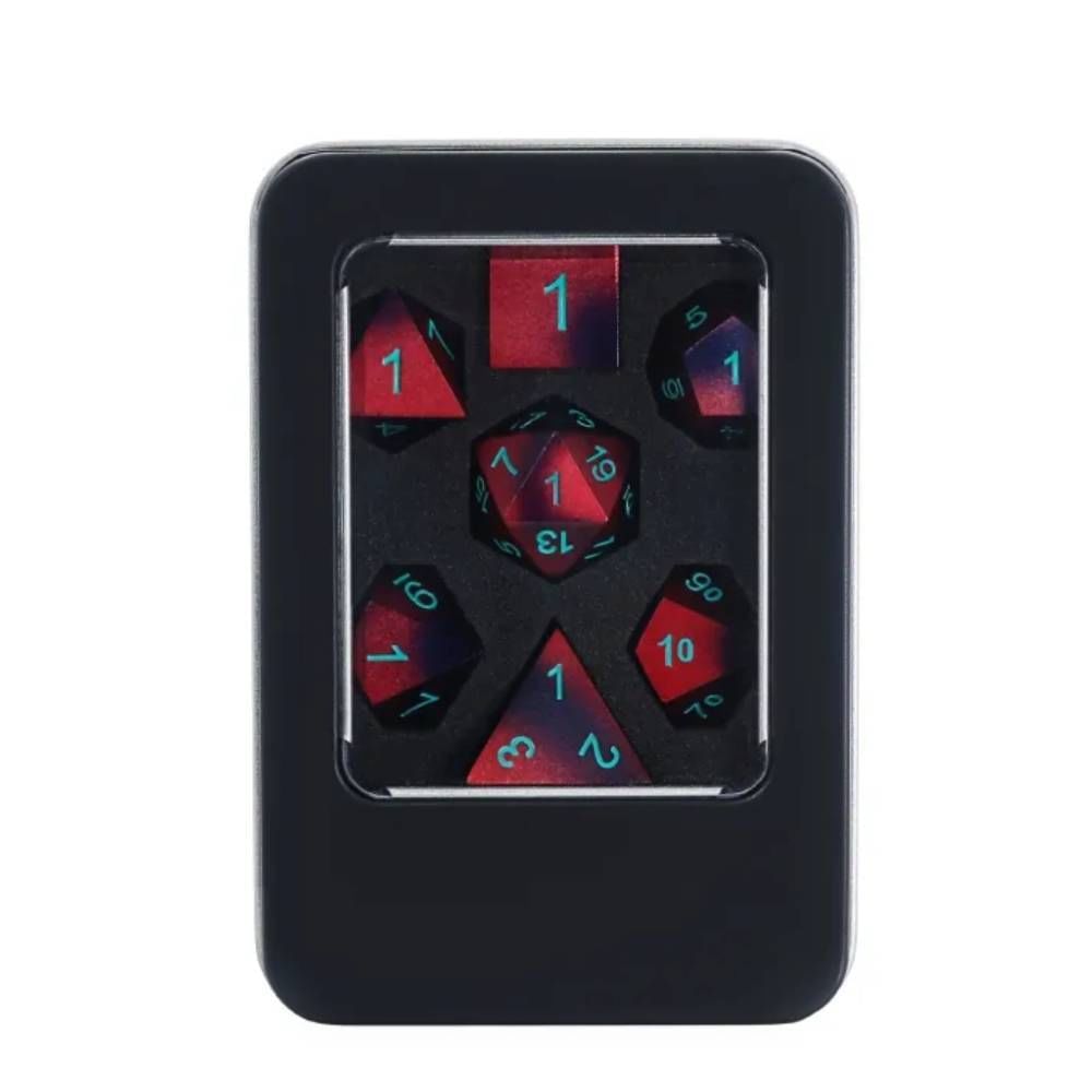 Táto sada kovových kociek v červeno-fialovom prevedení s tyrkysovo žiariacimi číslicami pôsobí ako relikvia z dávno zabudnutej dimenzie. Kocky sú vyrobené z pevnej kovovej zliatiny, vďaka ktorej majú príjemnú váhu a pôsobia naozaj pevne. Každá strana je dokonale čitateľná a zvýraznená kontrastnou tyrkysovou farbou, ktorá pripomína žiaru nadprirodzenej sily.