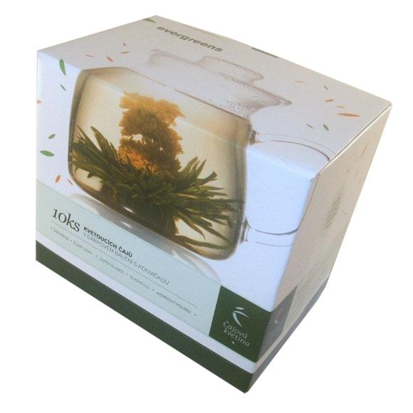 V krásnom darčekovom balení sa ukrýva kanvička z varného skla s objemom 0,6 litrov a sada 10-tich kusov rôznorodých kvitnúcich čajov.