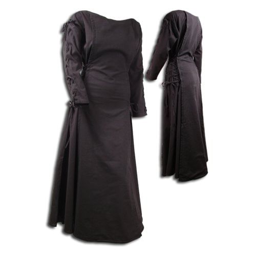 Čierne šaty s dlhými rukávmi vyrobené z bavlneného plátna, opatrené bočným šnurovanie pre perfektné vytvarovanie na ženskej postave. Ideálne larpový kostým čarodejnice, kňažky či asasínky. K dispozicii vo veľkosti S, L a M