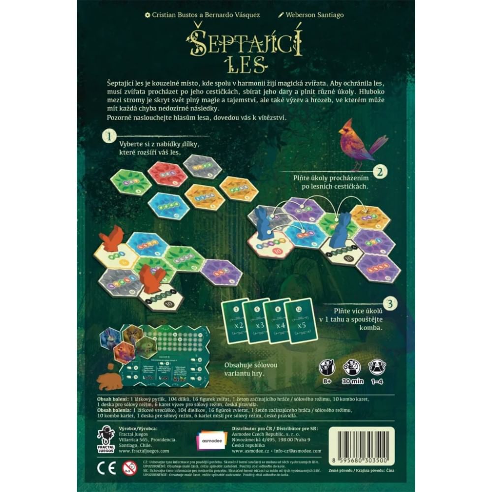 V hre Whispering Forest sa staneš sprievodcom štyroch druhov magických zvierat (medveď, líška, zajac a sova), ktoré obývajú čarovný les opradený tajomstvom. V tichu machom pokrytých chodníkov a pod korunami šumiacich stromov si každý z vás postaví svoju vlastnú časť lesa tak, že na seba poskladá dieliky a umiestni na ne svoje zvieratká. Tie sa potom vydávajú na cestu po lesných cestičkách, kde musia plniť úlohy podľa farebných kombinácií - len tí, ktorí sa pohybujú lesom s rozvahou a počúvajú jeho šepot, získajú vytúžené body.