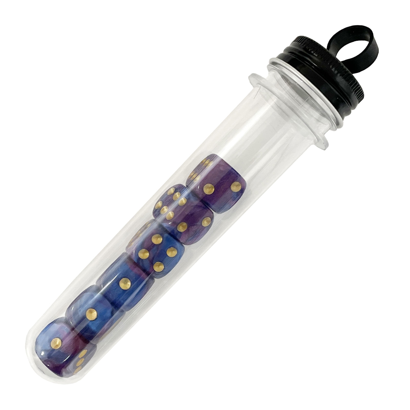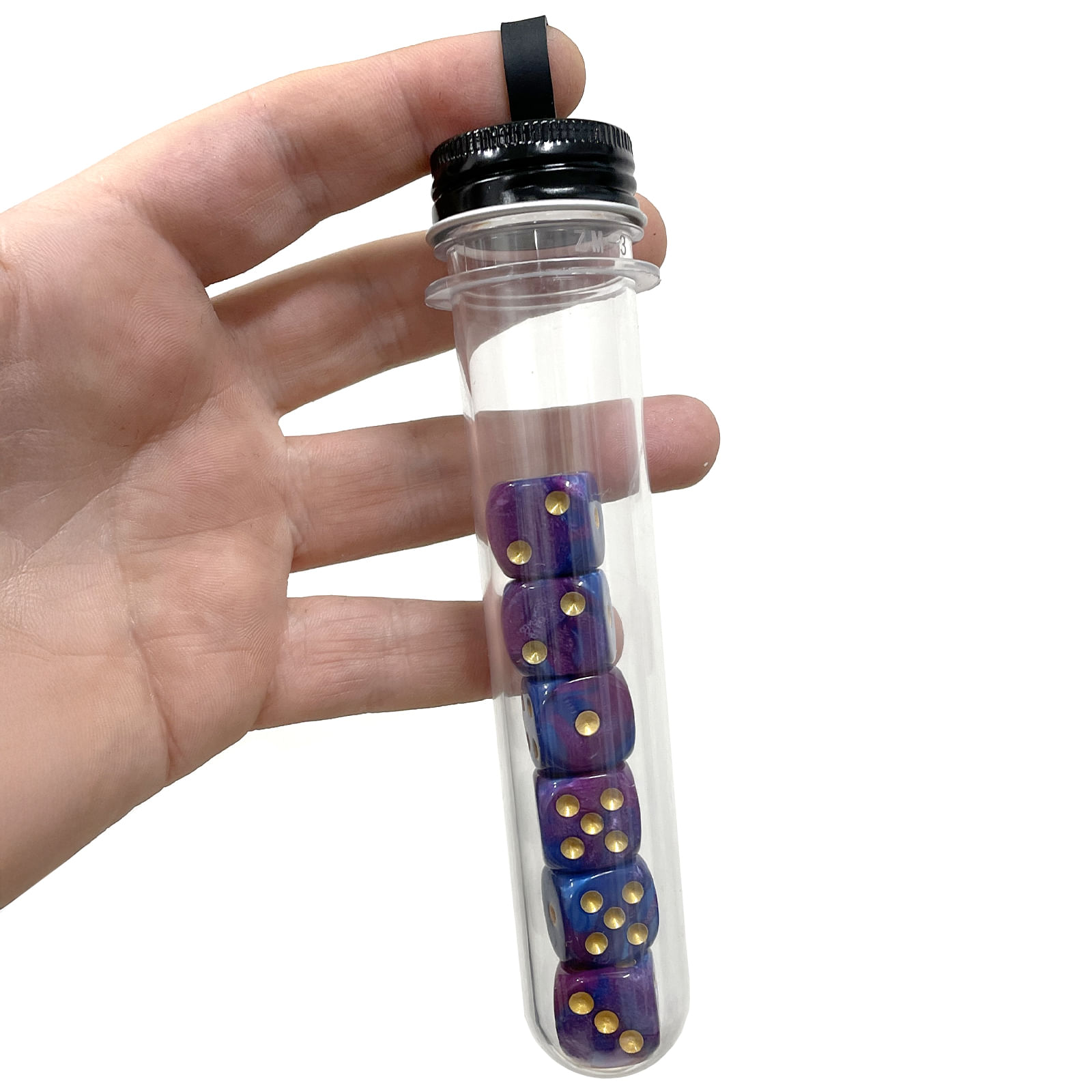 Prenosné plastové puzdro na hracie kocky je praktickým doplnkom pre tvoju hádzaciu zbierku. Skúmavka má skrutkovací uzáver, výšku 15 cm a priemer hrdla 3 cm. Súčasťou vršku je aj záchytné gumové uško.