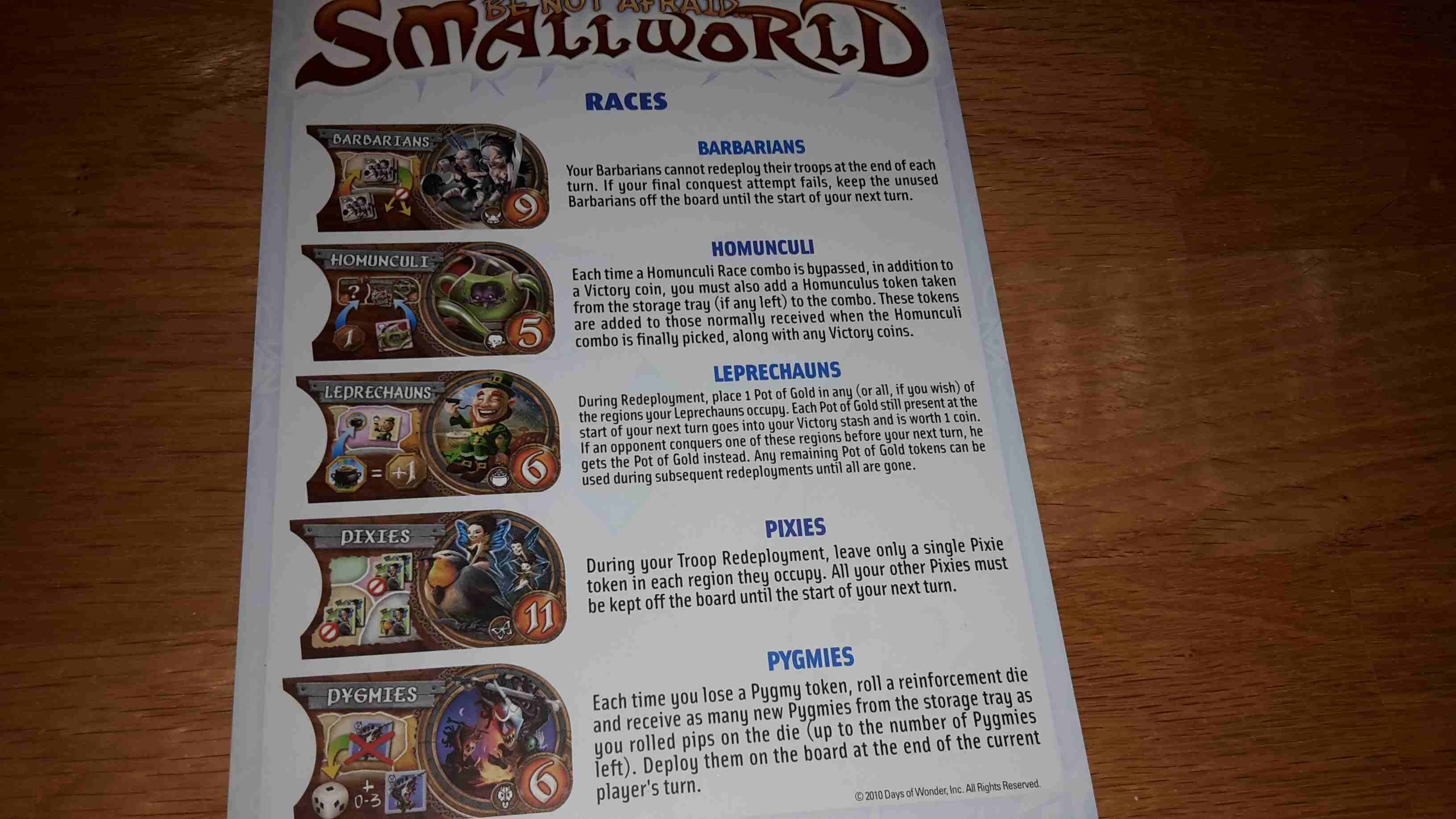 Rozšírenie k populárnej fantasy hre Small World, ktoré prináša do hry päť nových rás (barbarskú hordu, homunkuly, škriatkov, lietajúce víly a pygmee) a päť nových schopností - úplatnosť, zvrchovanosť, námezdnost, barikády a katapulty. Navyše obsahuje toto rozšírenie užitočný zakladač, do ktorého možno prehľadne uložiť všetky žetóny z existujúcich rozšírenia.