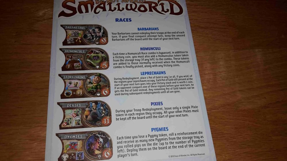 Obsah balenia : 5 nových rás, 5 nových špeciálnych schopností, 1 náhradná vlajka rasy, 1 náhradné žetón špeciálne schopnosti, plastový zásobník na žetóny, pravidlá v angličtine (k mání je český preklad ).