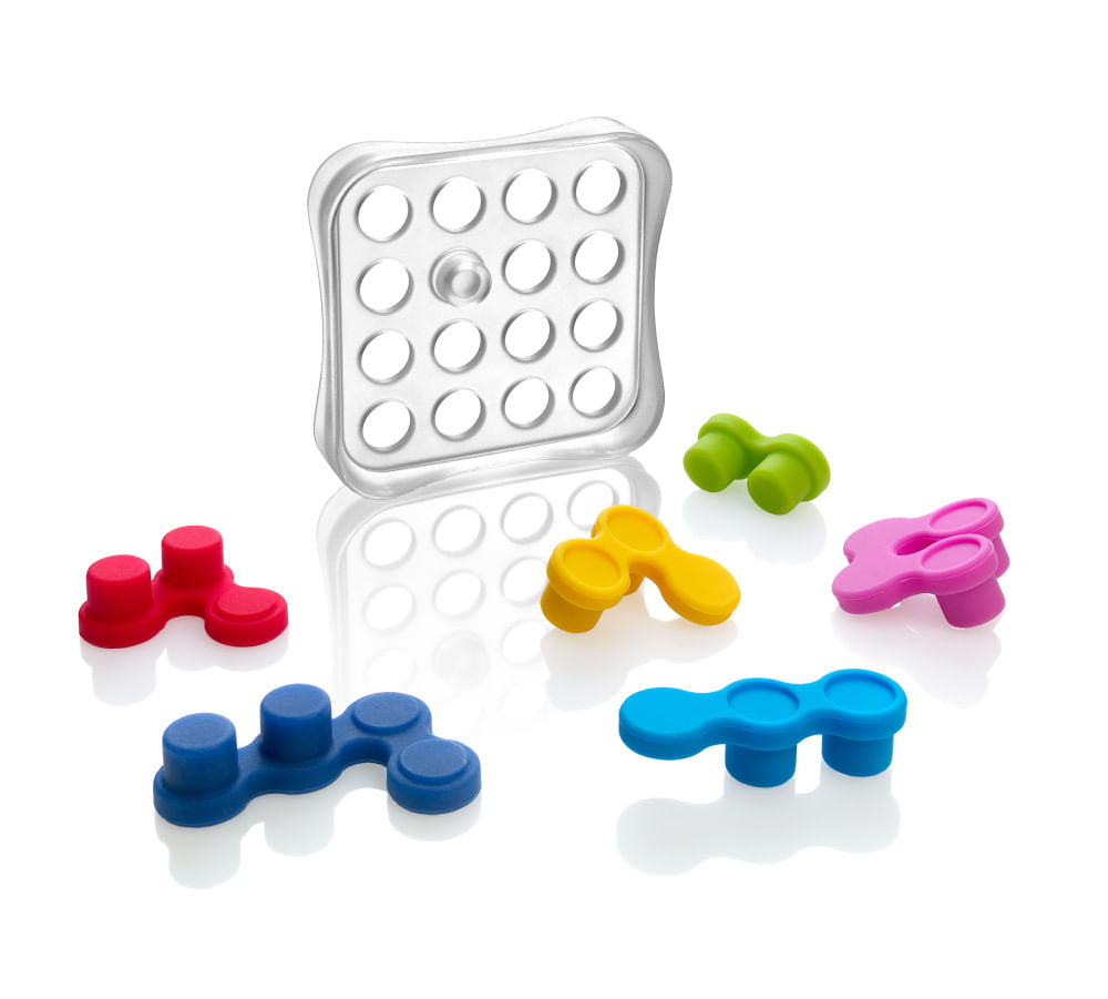 Funguje to tak, že do rámčeka umiestniš na ľubovoľnú pozíciu najmenší zelený dielik. Ostatné dieliky potom dovkladáš do rámčeka tak, aby nič neprečuhovalo a všetky otvory boli plné.