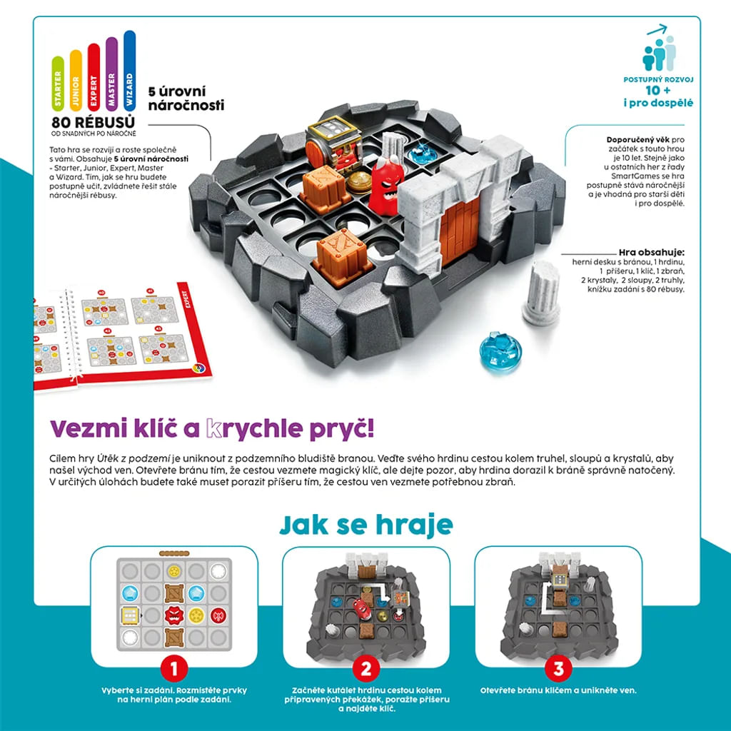 Útěk z podzemí je logická hra pre jedného hráča z produkcie Smart Games, v ktorej je tvojou úlohou zobrať kľúč a uniknúť z podzemného bludiska bránou.