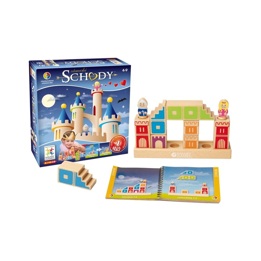 Hlavolamová hra pre jedného hráča z radu SMART games. Keď princ hľadá svoju princeznú ... Princeznú uväznil zlý čarodejník vo veži! A statočný princ sa vydáva na jej záchranu. Pomôžete mu? Postavte z krásnych drevených dielikov schody a mosty tak, aby princ mohol zachrániť princeznú. Posilnite svoje mozgové závity s touto krásnou drevenou 3D logickou hrou. V hre nájdete ako jednoduché úlohy pre staviteľa začiatočníkov, tak aj úlohy náročné pre skúsených architektov. Hra Zámocké schody je vytvorená tak, že rovzíjí logické myslenie a priestorovú predstavivosť.