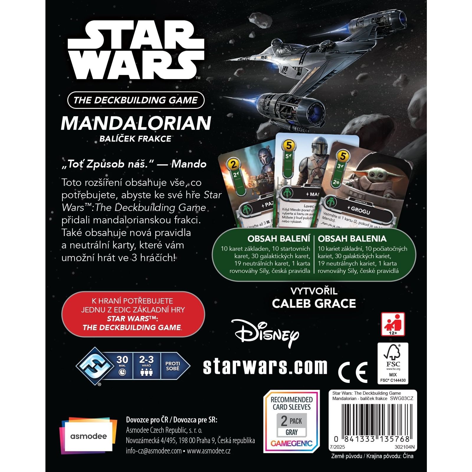 Rozšírenie Mandalorian obsahuje všetko, čo potrebujete, aby ste do svojich kartových bitiek v hre Star Wars: The Deckbuilding Game pridali frakciu Mandalorianov a nový herný režim pre troch hráčov. Objavte čestných bojovníkov, ktorí nikdy nezabúdajú na svoje Cesty - dokonca ani v srdci galaktického konfliktu. Bo-Katan, Din Djarin alias Mando alebo zbrojnoš - tí všetci tu zohrávajú svoju úlohu v boji za česť, prežitie a budúcnosť svojho národa.