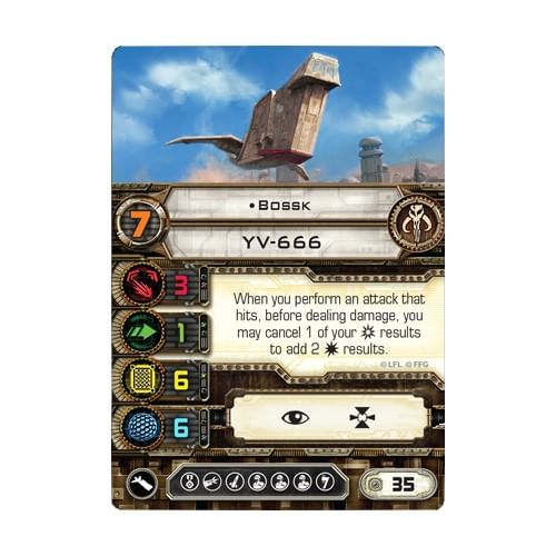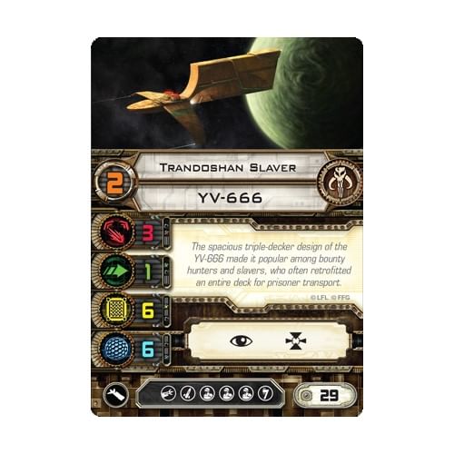 Jedna z pěti velkých Scum lodí, obsahuje 4 piloty: •Bossk •Latts Razzi •Moralo Eval Trandoshan Slaver a spostu upgrade kartiček, zejména užitečné kousky jako: Crack Shot Engine upgrade Glitterstim a Lonewolf. Dobře se kombinuje se dvěmi Contracted Scouty.