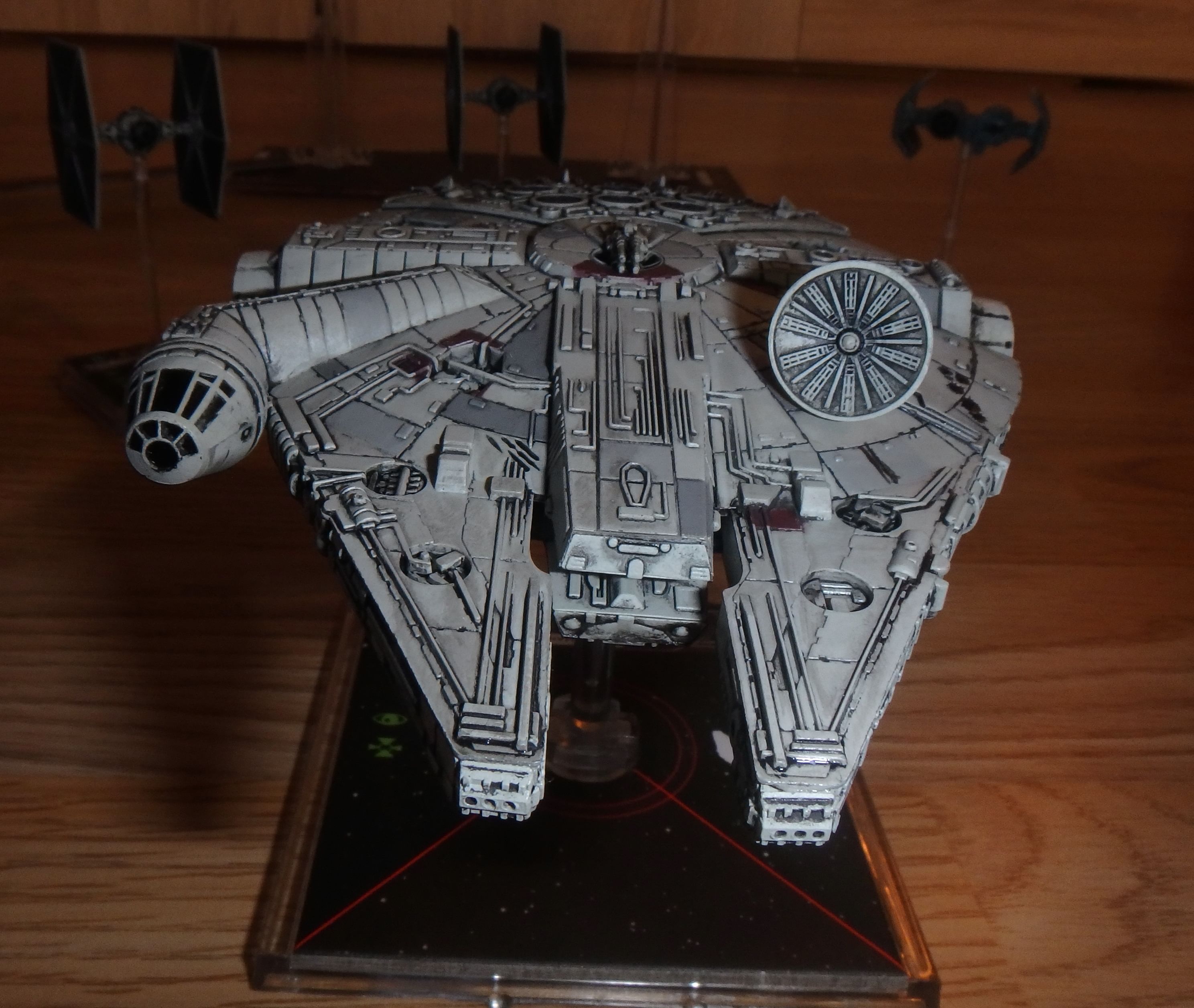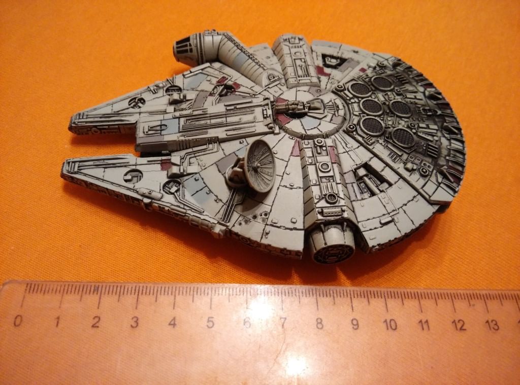 Krásně zpracovaný model, v základu je to nákladní loď YT-1300, Milennium Falcona z ní udělají až přiložené karty vylepšení a posádky. Jen stojánek se mi zdá na tak velký model trochu vratký a při častém hraní se časem nejspíš vychodí.