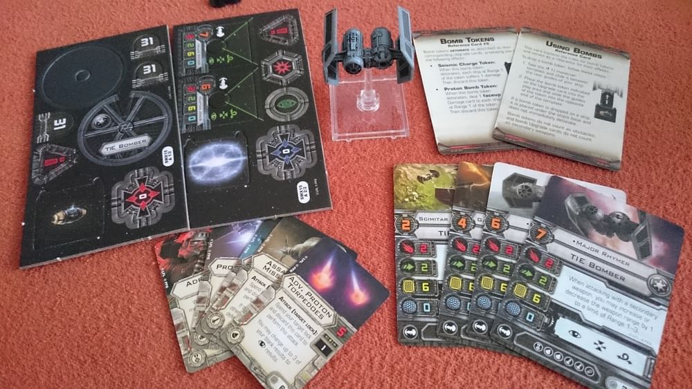 Aj keď nie je tak vrtký a rýchly ako ostatné varianty tohto typu stíhačky, je TIE Bomber schopný vďaka svojej palebnej sile zničiť prakticky akýkoľvek nepriateľský cieľ. Každá táto stíhačka unesie dve torpéda, dve rakety a jednu bombu. Sada teda obsahuje 5 kariet vylepšenia so širokou škálou zbraní, vrátane zničujúce protónovej bomby. V sade nájdete 1 úžasnú miniatúru, manévrovací voľby, všetky potrebné žetóny a 4 nové talentovaných pilotov.