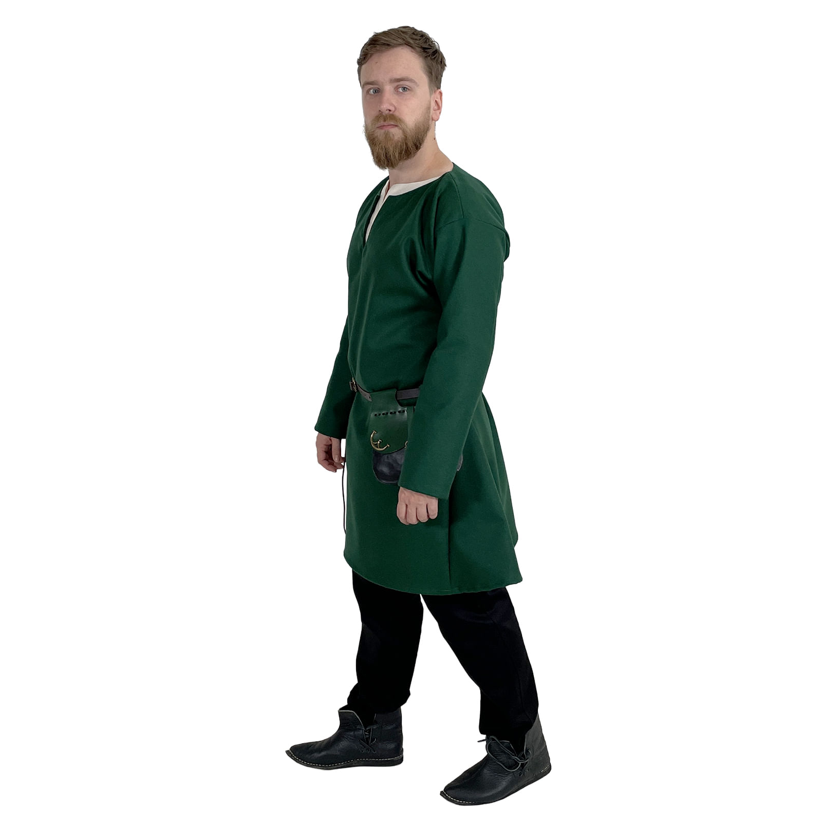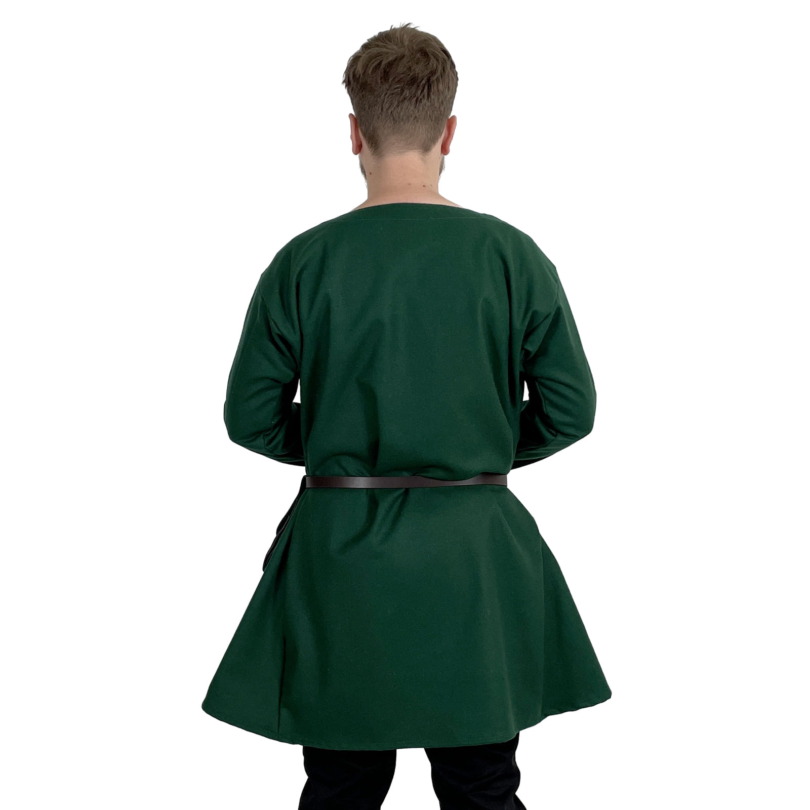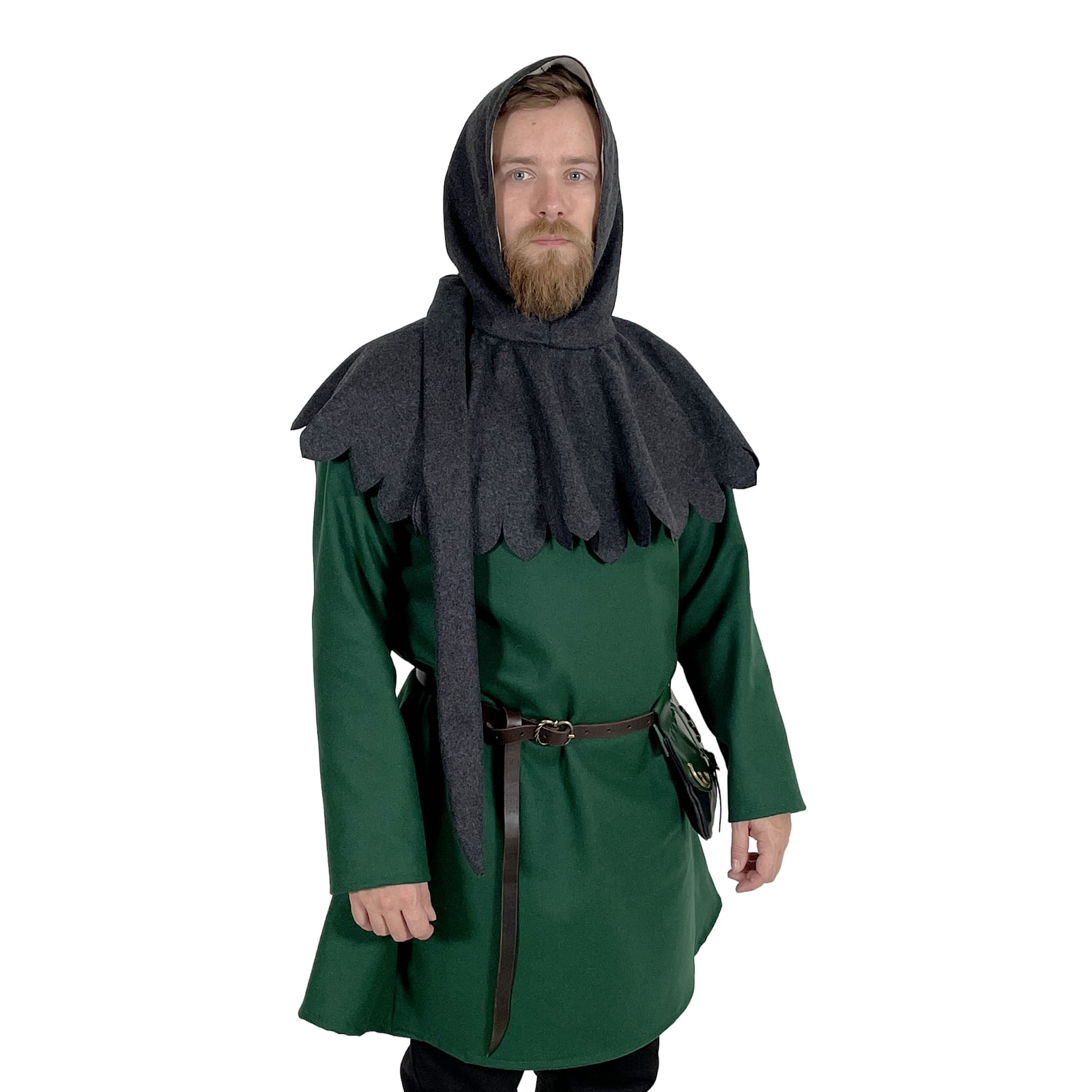Ušitá podľa strihov z 12.–15. storočia, z kvalitnej vlny, ktorá hreje, dýcha a drží tvar aj po celom dni v zbroji, pri ohni alebo v daždi. Zelená farba ľahko zapadne medzi prírodné tóny – ladí s hnedým plášťom, koženým opaskom aj jednoduchými nohavicami.