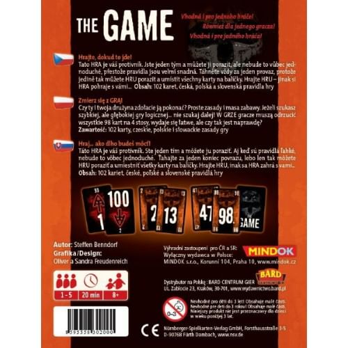 The Game je spoločenská kartová hra, v ktorej sa stáva sama HRA vaším protivníkom. Hráči v nej hrajú spoločne proti hre a to tak, že striedavo prikladajú očíslované karty na jednu zo štyroch herných kôpok - na dve karty od najnižšej po najvyššiu a na dve naopak. Pravidlá hry sú veľmi jednoduchá, hra však napriek tomu poriadne nažhaví vaše mozgové závity. navyše budete musieť spolupracovať bez toho aby ste si vzájomne odtajneniu čísla, ktoré držíte a ruky.