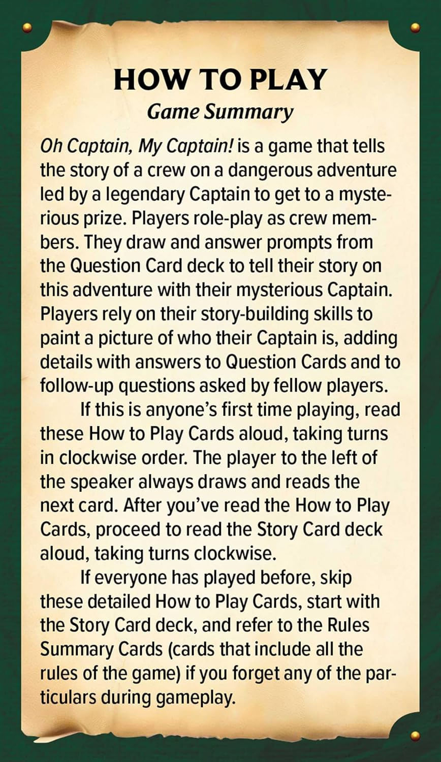 Oh Captain, My Captain! je svižná kartová RPG hra zameraná na budovanie sveta, hrdinstvo a zložité medziľudské vzťahy. Bola navrhnutá tak, aby umožnila hráčom spoločne rozprávať silné a nezabudnuteľné príbehy počas iba 30 minút. Sada obsahuje 95 katier s otvorenými otázkami, vďaka ktorým hráči postupne odhaľujú ich postavy, svet, v ktorom žijú, ich kapitána - a predovšetkým komplikovaný vzťah k tejto žijúcej legende.
