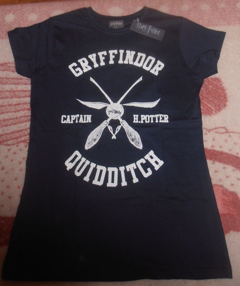Kvalitné bavlnené dámske tričko opatrené potlačou symbolizujúcim dve skrížená metiel a zlatú strelu - atribúty z hry zvanej metlobal z Harryho Pottera.