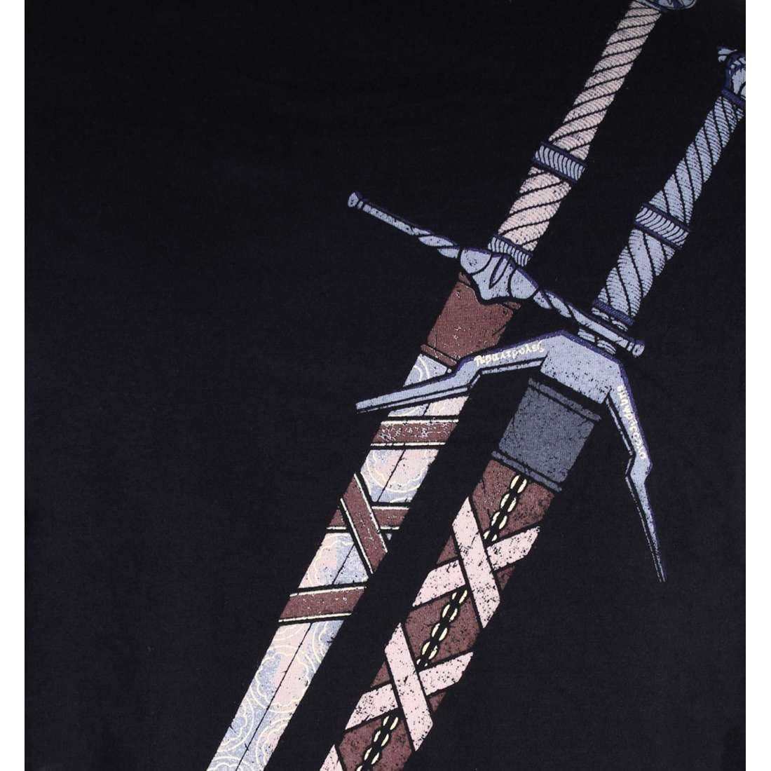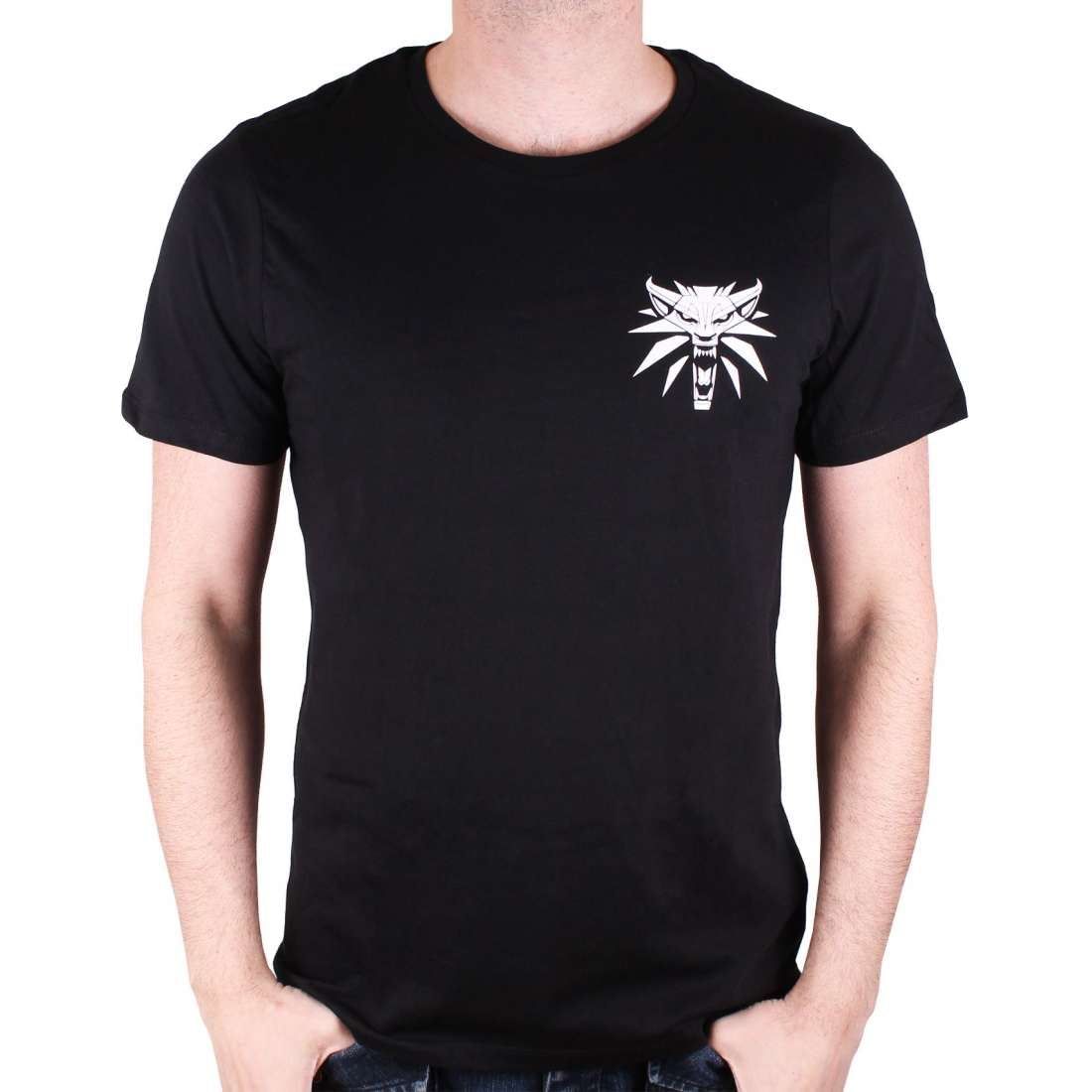 Čierne pánske tričko s bielym logom zaklínača Geralta z Rivie na prsiach a s vyobrazením jeho oceľového a strieborného meča na chrbte.
