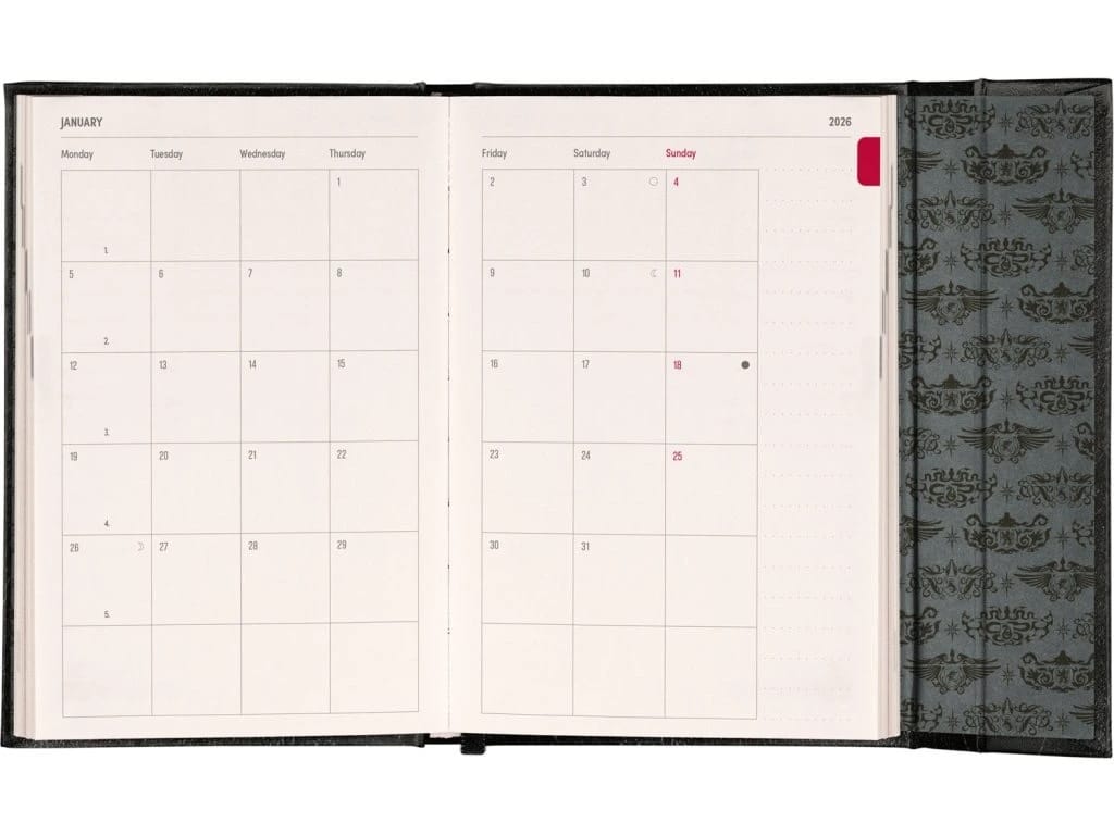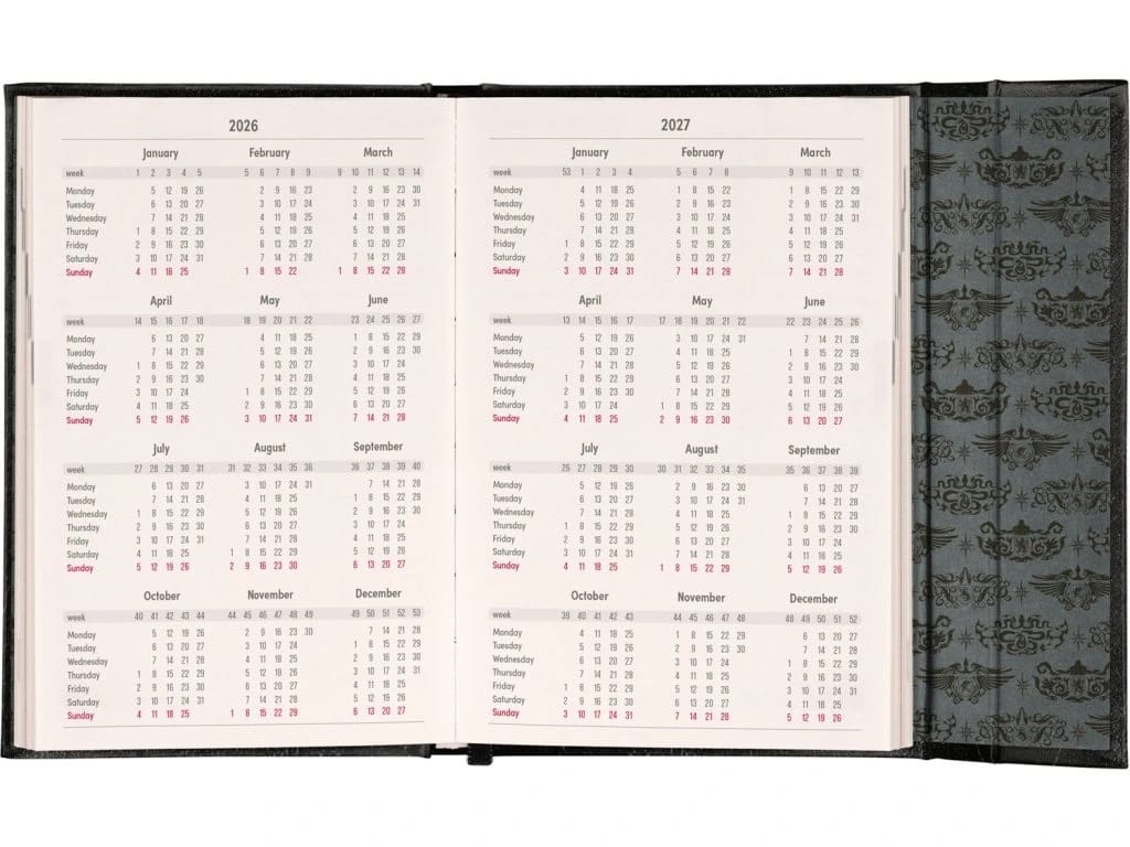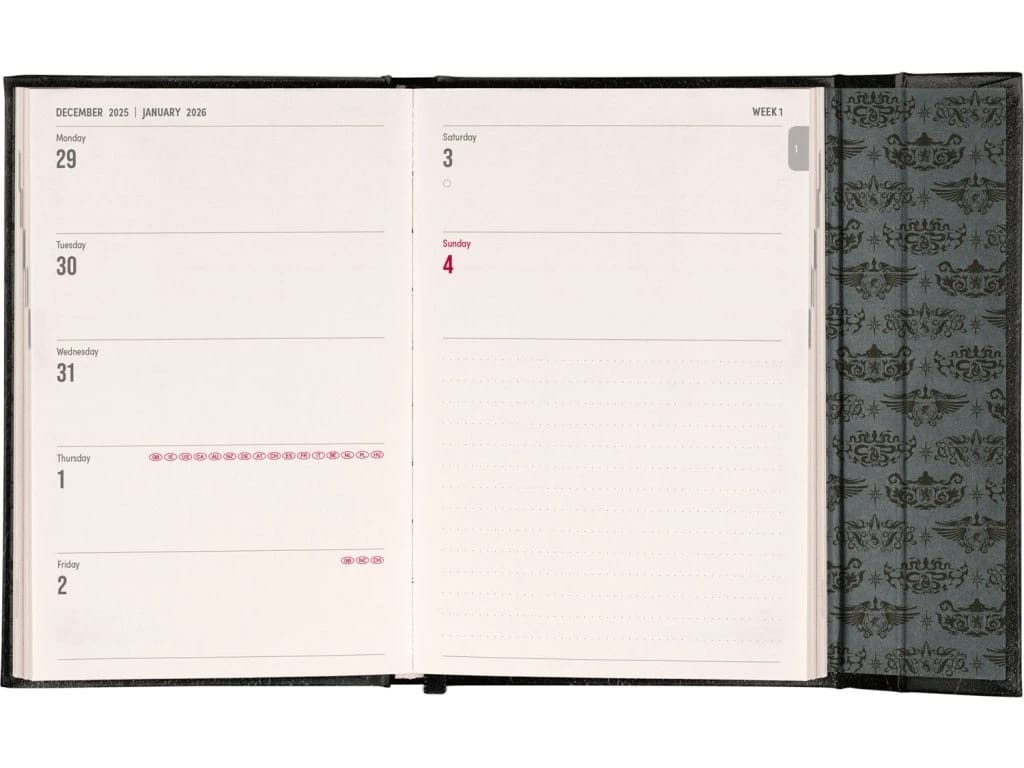 Diár ponúka prehľadný týždenný kalendár, kde na jednej dvojstrane vidíte celý týždeň. Veľkým bonusom je pevné viazanie s magnetickým zapínaním. Vďaka tomu sa vám diár v batohu neotvorí a strany zostanú rovné počas celého roka.