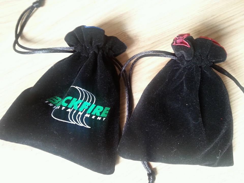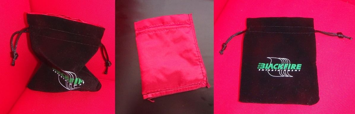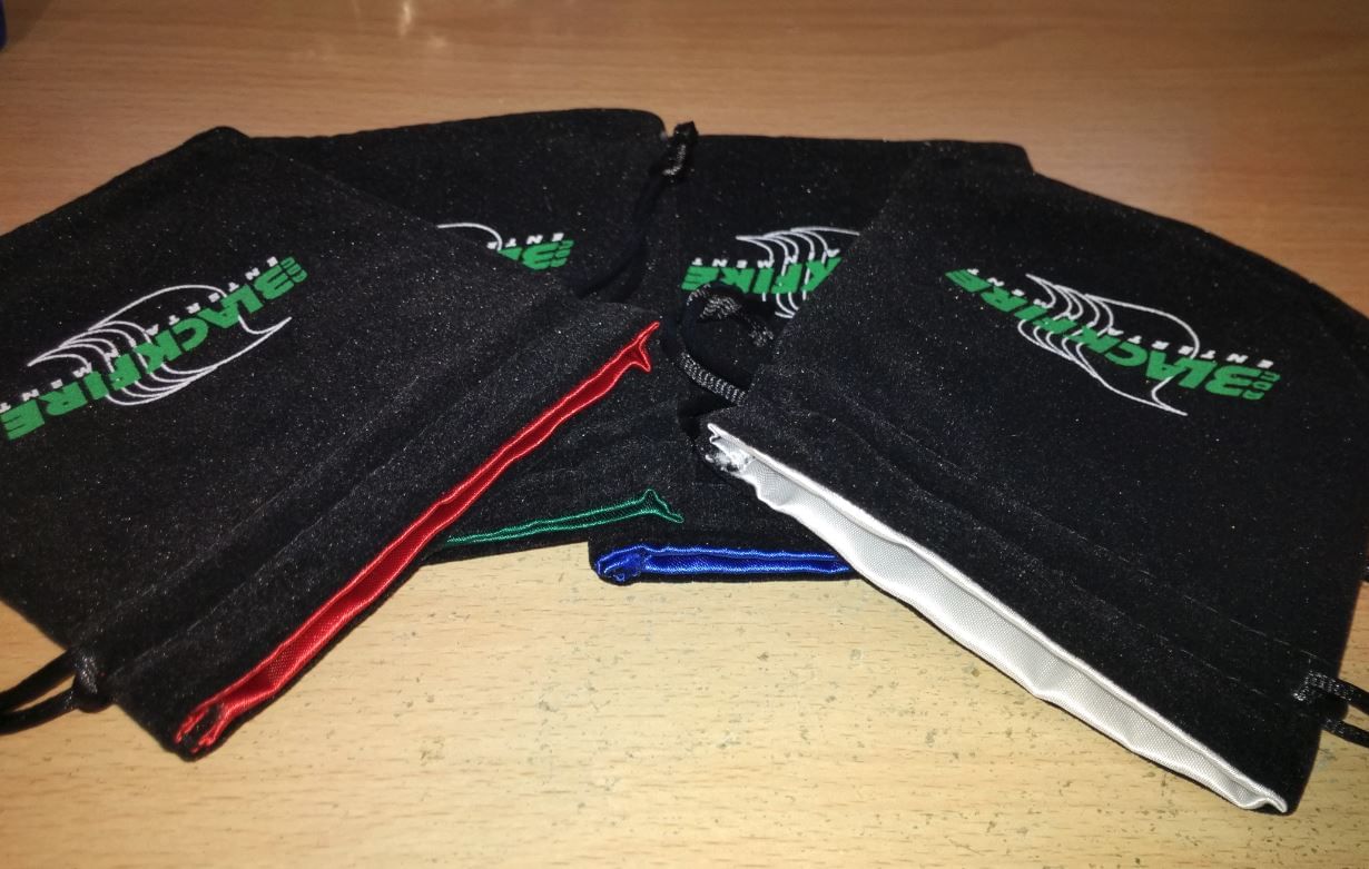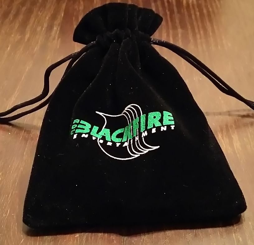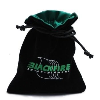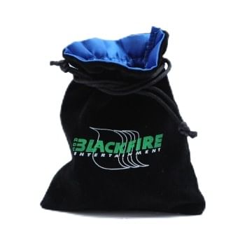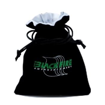 Kvalitný značkový čierny zamatový vačok na kocky s logom "ADC Blackfire Entertainment", so saténovou podšívkou v rôznych farbách: červená, fialová, biela, modrá a zelená.