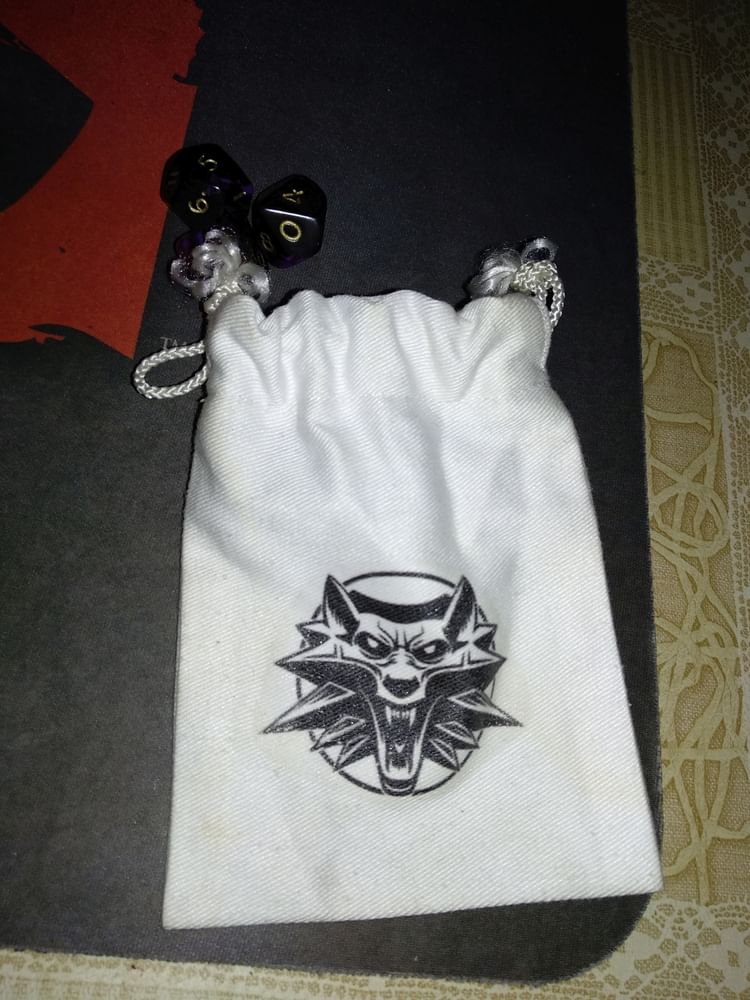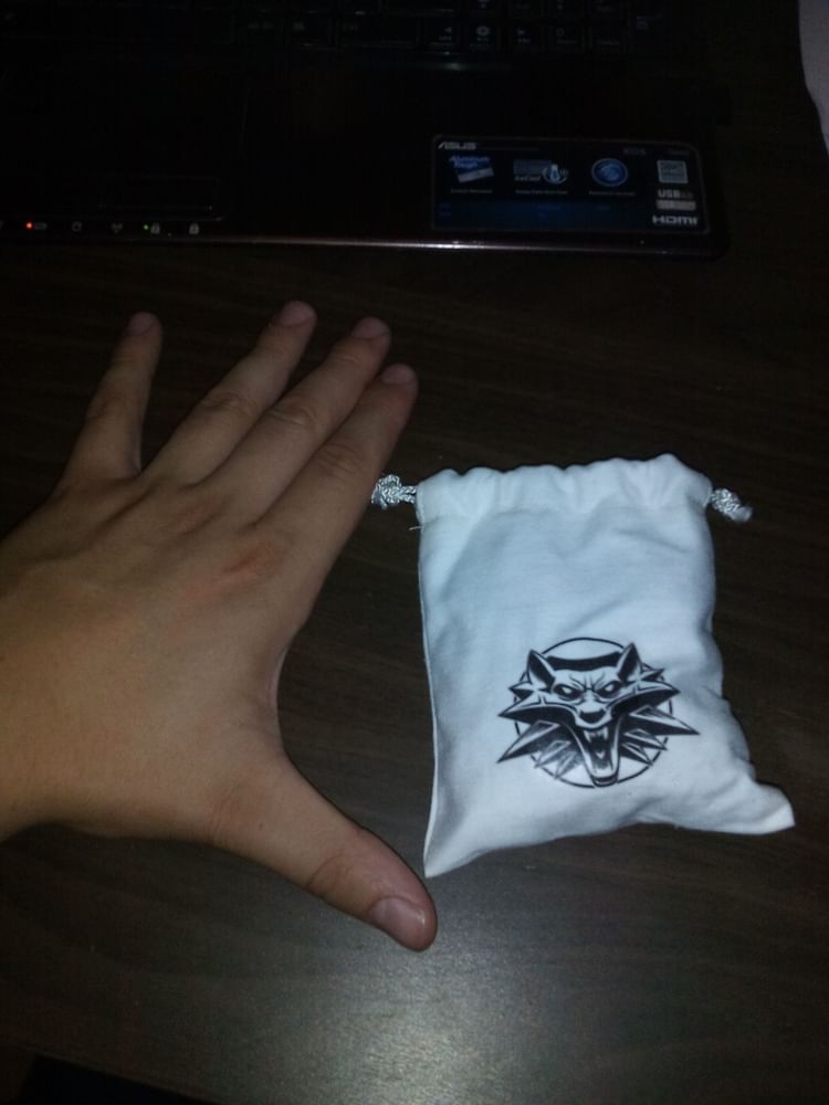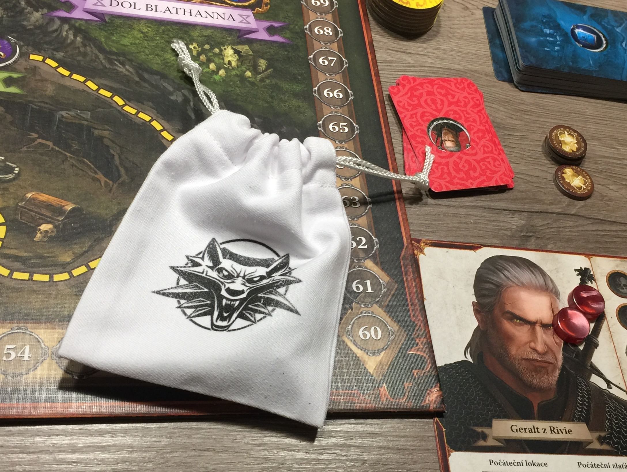 Pěkný váček s logem zaklínače, schovávám do něj žetony z deskové hry Zaklínač, pěkně se vejdou a vypadá to stylově.