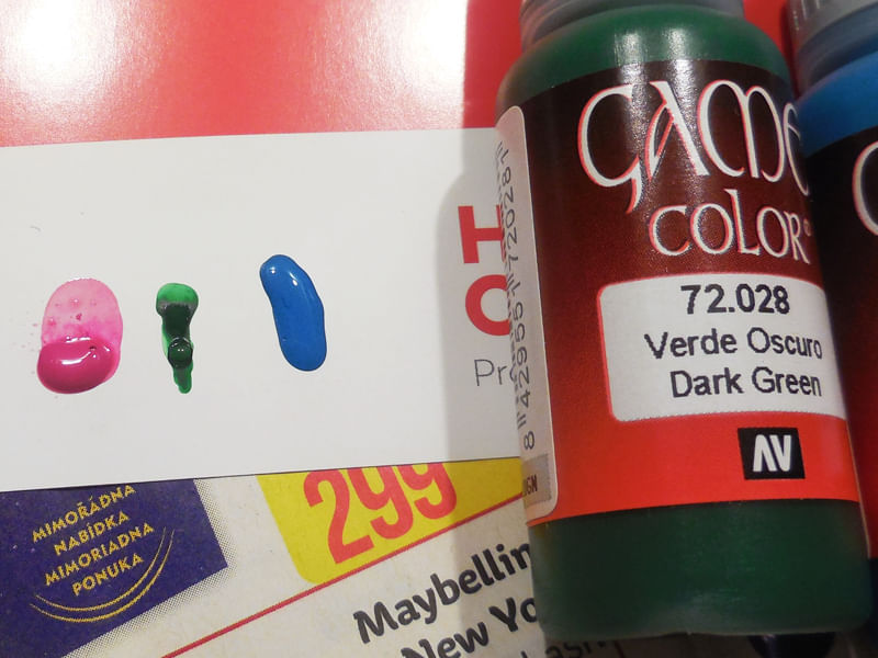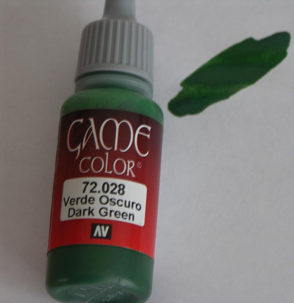Valejo barvy mám už vyzkoušené a jsou velmi dobré - nezasychají na paletě tak hrozně rychle jako Citadelky, takže se s nimi lépe pracuje. Kapátko je opravdu praktické. Nutno protřepat před použitím - jako každou jinou barvu. Odstín Dark Green je sice tmavší zelená, ale stále velmi sytá barva, lze dobře zesvětlit přimícháním bílé, béžové, nebo žluté. Ideální svěží zelená na tmavší lesní porost atp. Celkově odpovídá odstín tomu na fotce láhve od výrobce.