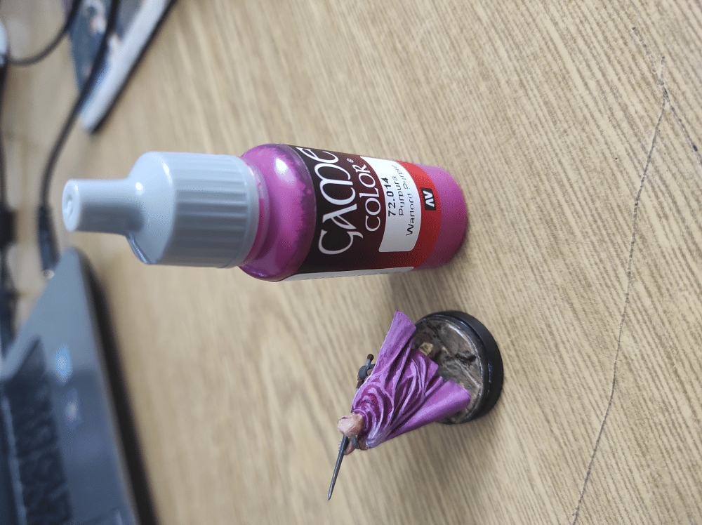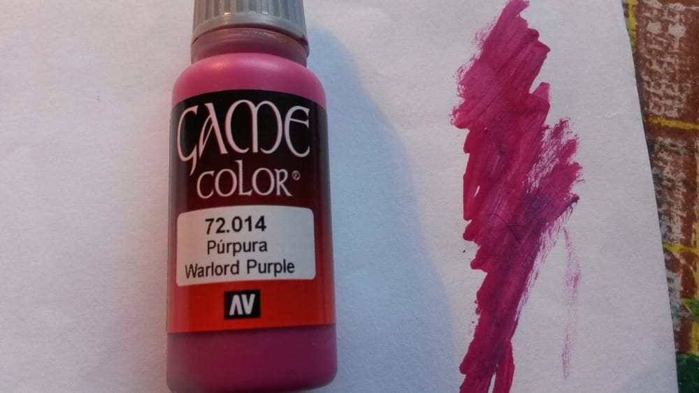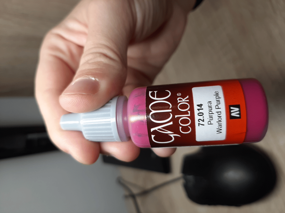 Tmavě růžová / světle fialová barva která je hodně blízko Screamer Pink od Citadel. Kryje dobře, ale chce to alespoň dva nánosy a barvu opravdu důkladně promíchat. Doporučuji do ní přidat nerezovou kuličku pro zlepšení míchání pigmentu a média. Na fotce použita na štítu a na topůrku zbraně. Navíc je odstín vidět na víčku lahvičky.