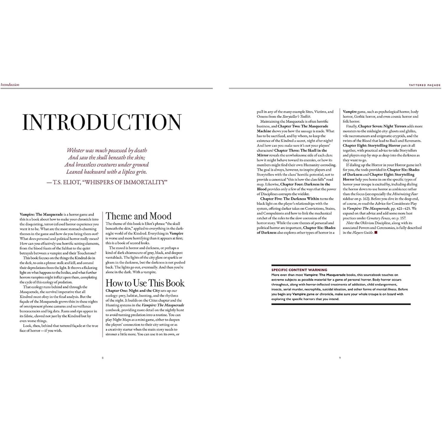Kindred predstavujú prázdnu obrazovku vonkajšiemu svetu: Maškarádu. Ale za tým sa hromadia hrôzy – na uliciach ich miest, v sieňach ich Dvorov a v Krvi v ich žilách. Táto hrôza prekypuje dravými zabíjaniami, zvráteným využívaním upírskej sily a postavenia a miliónmi striekancov a úlomkov. Pomaly skartujú fasádu Maškarády a to, čo za ňou vidíme, je hrôza. Za potrhanou fasádou je veľa tieňov a všetky stále ukrývajú temnejšie tajomstvá, od samotného Maškarného stroja až po tie horšie veci, ktoré čakajú na jeho zlyhanie. Táto kniha podrobne popisuje ekológiu a prehlbuje hrôzu hry Vampire: The Masquerade spoluprácou s hernými systémami na výbere odtieňa temnoty: telesný horor, gotický horor, ľudový horor alebo dokonca kozmický horor.