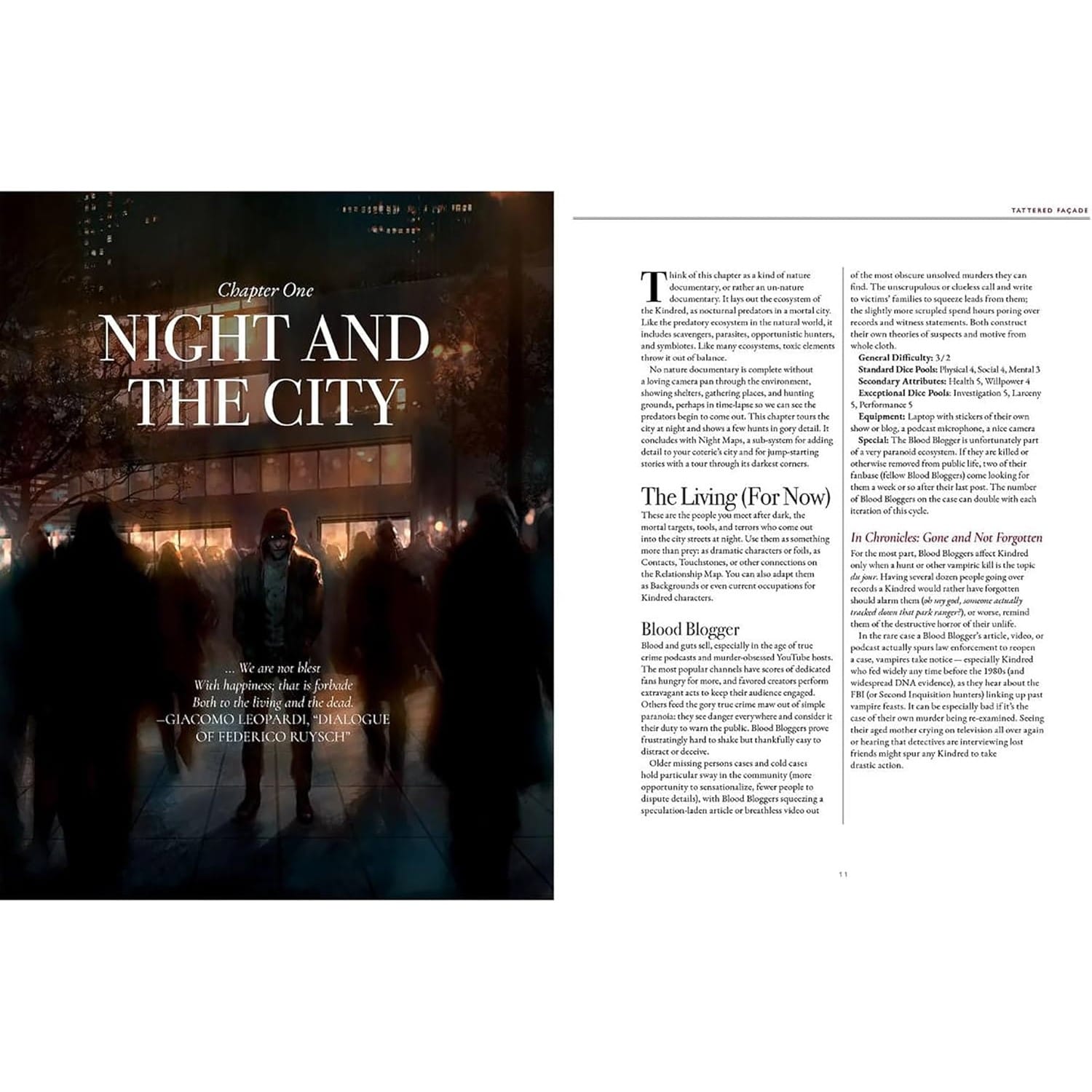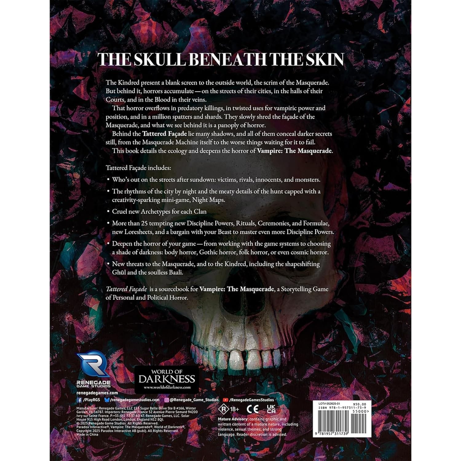 Tattered Façade je 17. vydanie v pevnej väzbe pre Vampire: The Masquerade, žánrovo definujúcu hru rozprávania príbehov o osobnom a politickom horore.