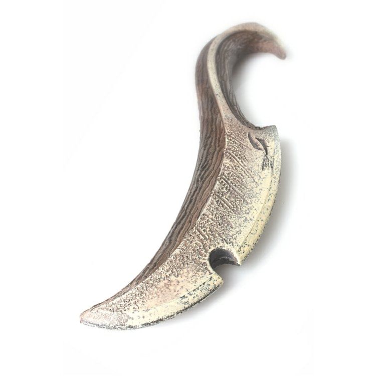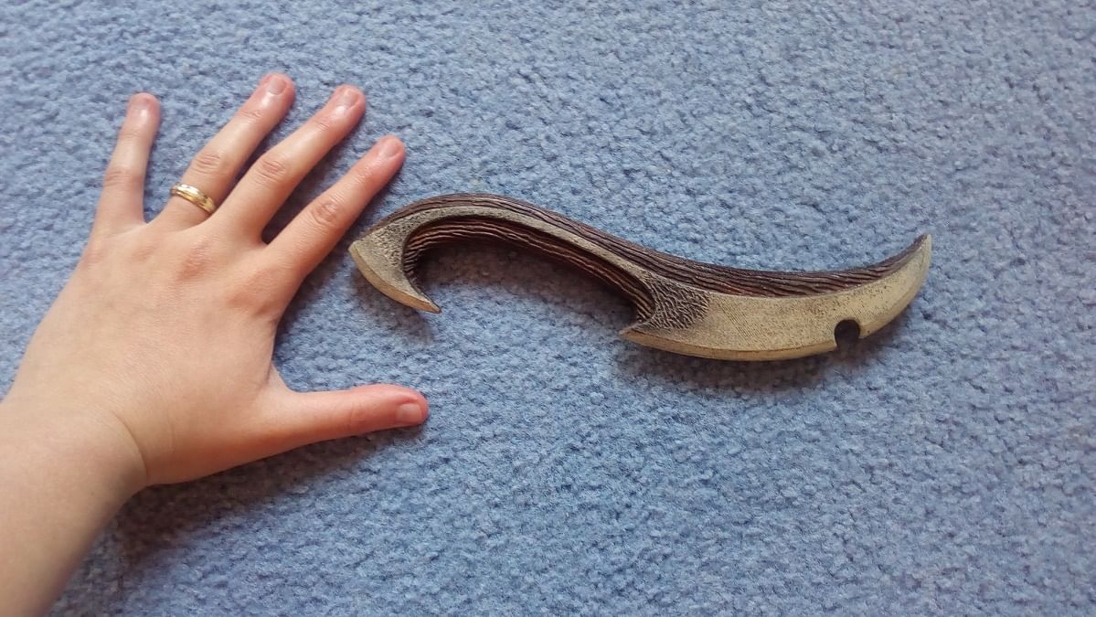 Na pohled nádherná práce a na pohmat pěkná textura i materiál. I velikost je tak akorát, vypadá dobře v mužské i ženské dlani, přesto má jednu vadu - i když je "ostří" pevné, celá dýka se ohýbá jako guma gumová, a to tak že hodně - prakticky není možné udělat svižnější pohyb bez ohýbacího efektu. Přitom při vržení a zasažení zbraň pěkně pleskne (a věřím, že způsobí i slušnou modřinu). Takže na larp ano, orgové ji schválí, hned se nerozpadne a otravného nepřítele můžete zákeřně zasáhnout, ale třeba jako rekvizita do videa či filmu bohužel ne moc použitelné. :)