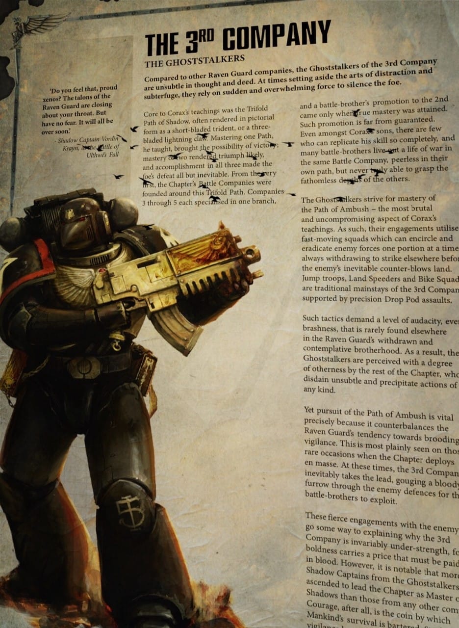 Táto kniha obsahuje pravidlá pre model Kayvaan Shrike - Master of Shadows, a ďalej Stratagems, Warlord Traits, psychickú disciplínu Umbramancy, Relics of the Ravenspire, a ďalšie herné informácie, vrátane pozadia Raven Guard a galérie nafarbených modelov.
